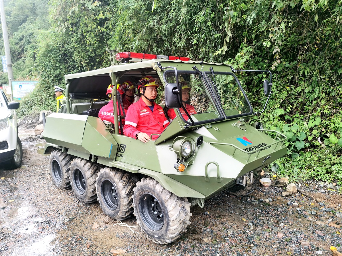 14时,抢险救援部署会后,该工程局救援队克服各种困难险阻,派出无人机进行现场勘察,6名救援员携带水路两栖全地形车、生命探测仪等搜救设备随时做好抢险救援准备。