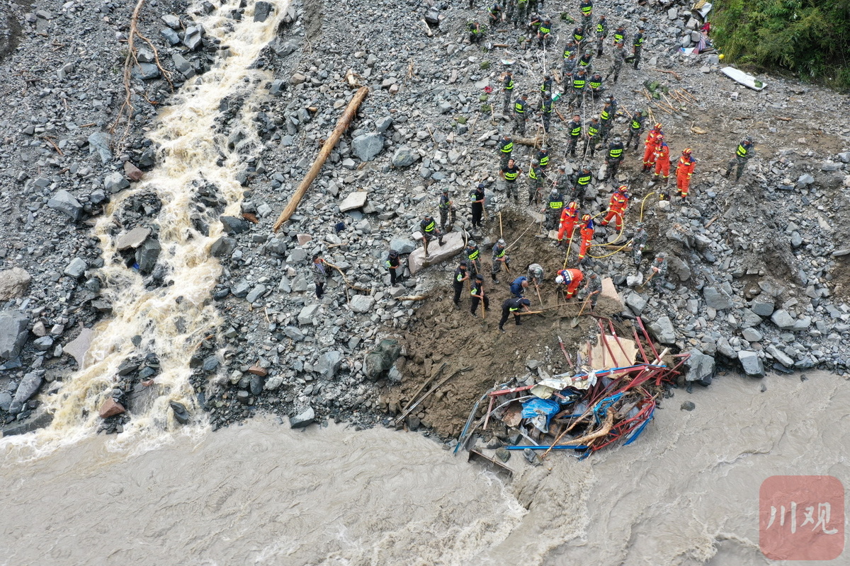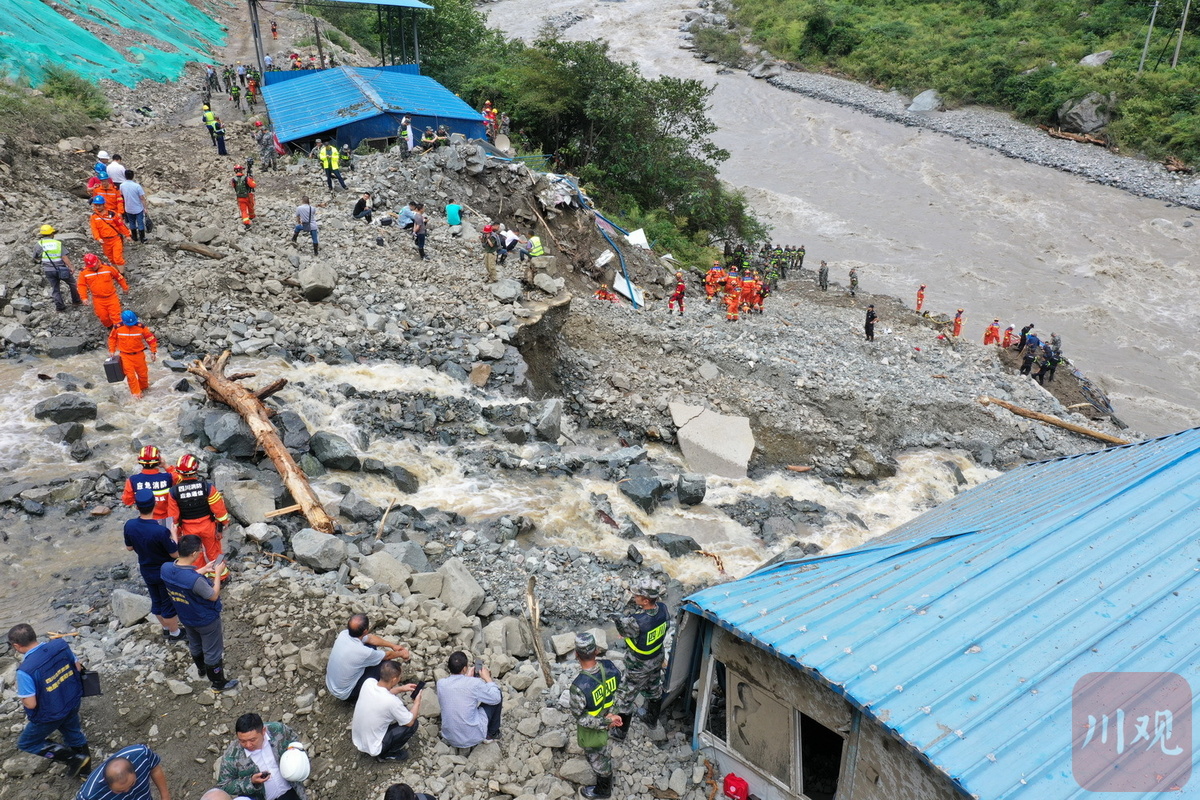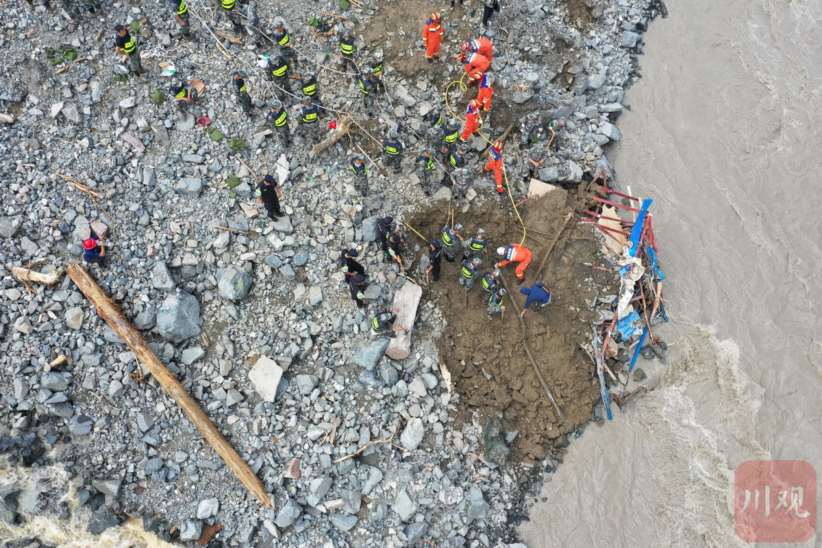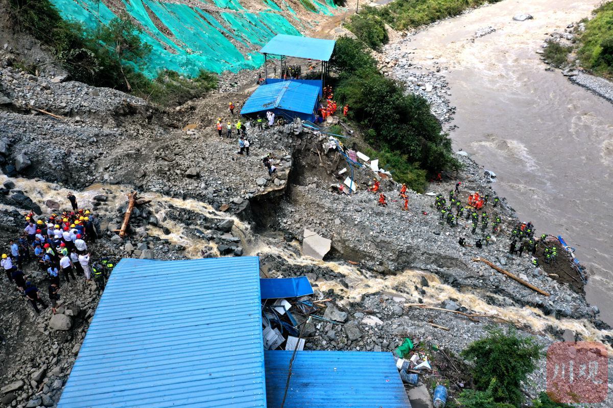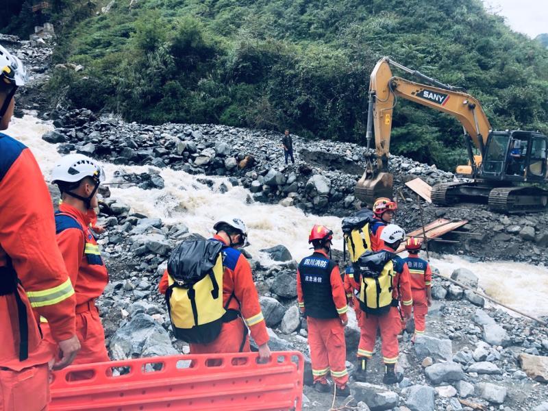 目前,记者在喇叭河镇龙头沟看到,受灾现场一处板房被冲毁一段,河面水势汹涌,救援队伍正利用生命探测仪、搜救犬等救援装备开展搜索和救援作业。