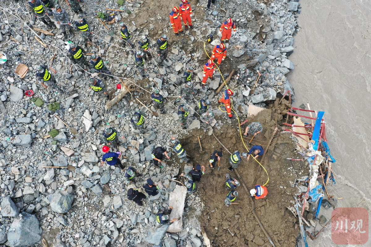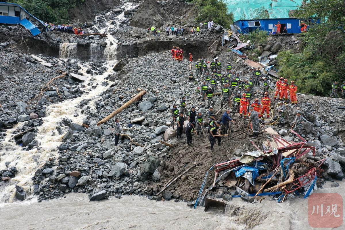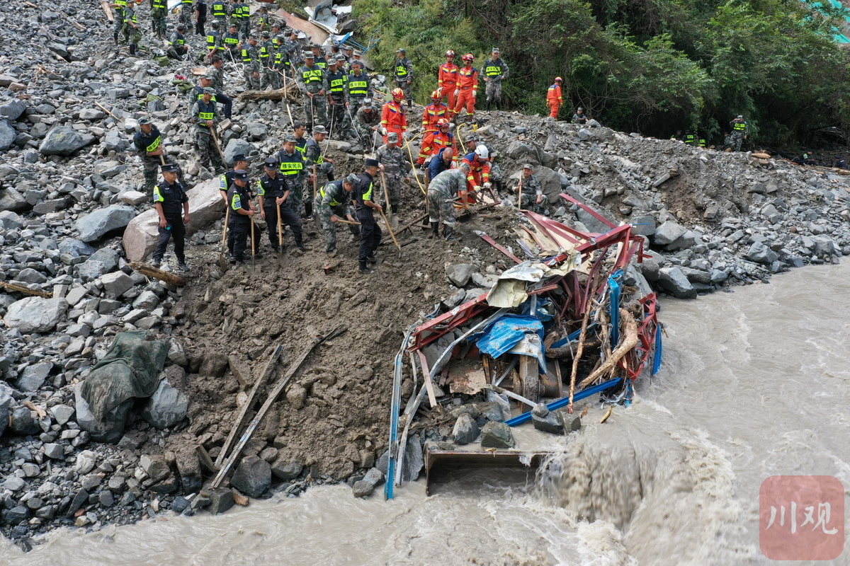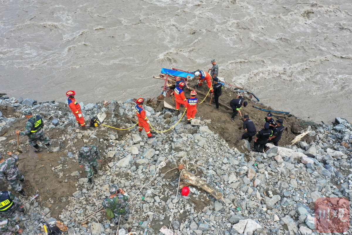 目前,记者在喇叭河镇龙头沟看到,受灾现场一处板房被冲毁一段,河面水势汹涌,救援队伍正利用生命探测仪、搜救犬等救援装备开展搜索和救援作业。
