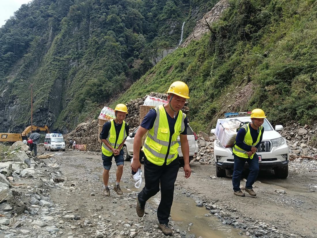 救援人员正将物资背到灾害现场。