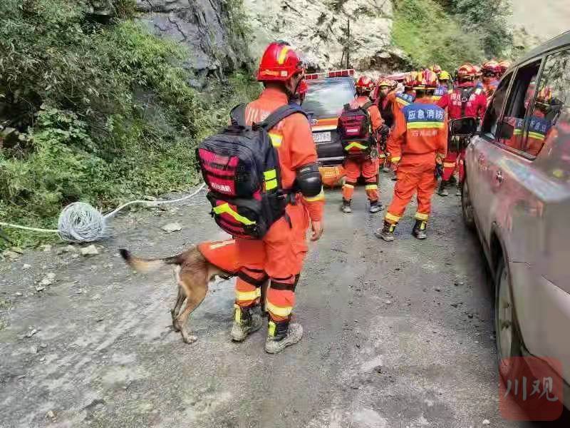 救援力量行进途中,发现老虎嘴隧道口处出现塌方,此时,距离灾害现场尚有5公里距离,由于道路、公网中断,救援力量携带救援装备徒步进入事故点展开救援。救援人员到达现场后利用生命探测仪、搜救犬等救援装备开展搜救和救援作业,同时,展开对被困群众进行转移营救。
