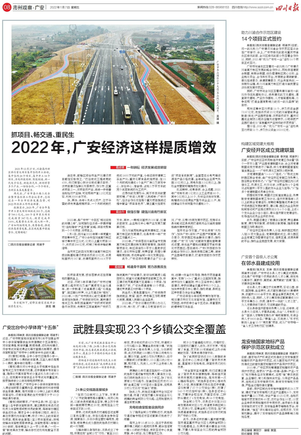 长期以来,广安存在交通边缘化的短板。会上透露,2022年,一批广安市民关心的交通建设项目也将加快推进。据了解,广安将做好机场、高铁相关工作,争取西渝高铁广安段预可研报告尽快获批、先期开工西渝高铁广安段及推进高铁广安站建设,做好绕城高速公路西环线、城宣大邻高速等项目前期工作,开工建设包茂高速高竹互通等11个项目,加快建设广武、广邻快速通道等10个项目,建成罗渡渠江大桥等4个项目。