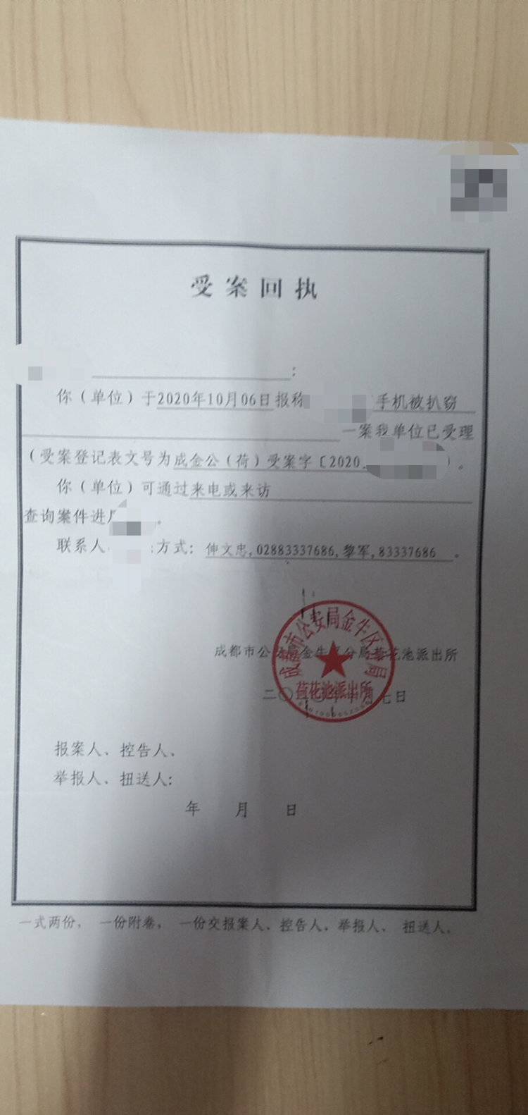张灵说,当地一早,大概八九点,自己就在成都市金牛区荷花池派出所报了案。其提供的受案回执显示,张灵于手机被扒窃一案已被受理。“目前警方回复还在调查。”张灵说。