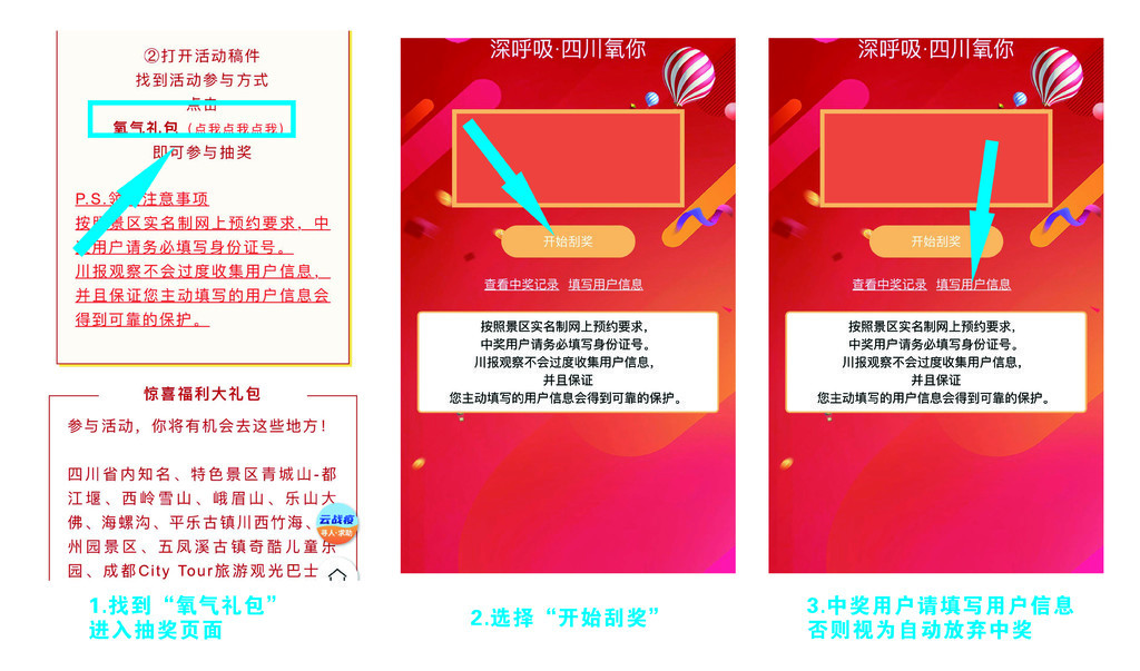 本次活动联动四川省知名景区,串联重点文化体验场景和项目,在释放四川美景与文化魅力的同时,也开展扫码送“氧气礼包”大型网络互动,全网送出数千张景区门票、年票、实景演出票、旅游巴士车票、酒店客房券等,我们每天将送出150张门票,诚意满满地向千万海内外游客发出邀请: