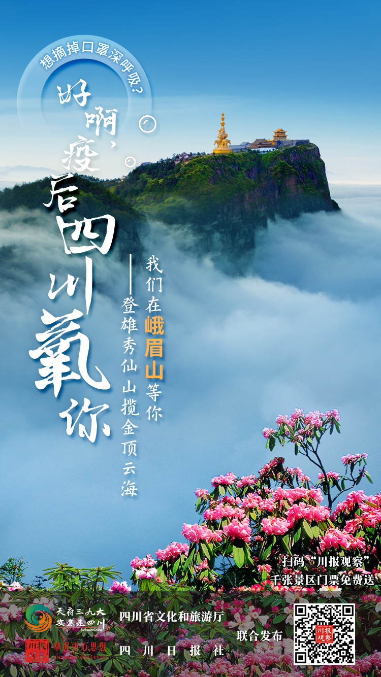 在本次四川省文化和旅游厅与四川日报社联合发起的“深呼吸 四川氧你”——四川旅游美景海报互动展示活动中,峨眉山为网友们壕气派送福利,免费提供100张景区门票,邀请宅家已久的游客在景区重新开放后来登山健身,赏春吸氧,采茶品香。同时,自景区恢复开放之日起一年内,全国医护工作人员可免费游览,并享受免费观看王潮歌导演的《只有峨眉山》演艺。