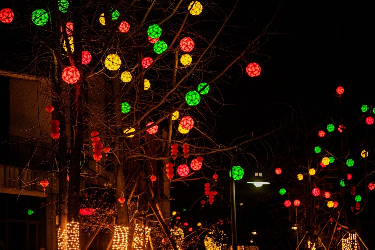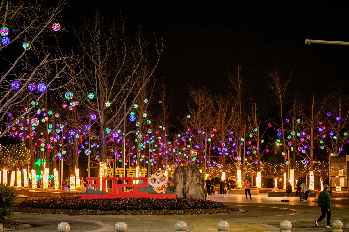 自贡灯会古法手工灯组“盛世海棠”“寅虎报春”等年味十足,一盏盏由自贡手工匠人制作的喜庆灯笼高高悬挂,位于中心公园和凤翔湖公园的互动灯组“生命之树”、水母彩灯等主题灯饰流光溢彩,盛放的海棠花灯组则彰显活力同时昭示着万象更新。