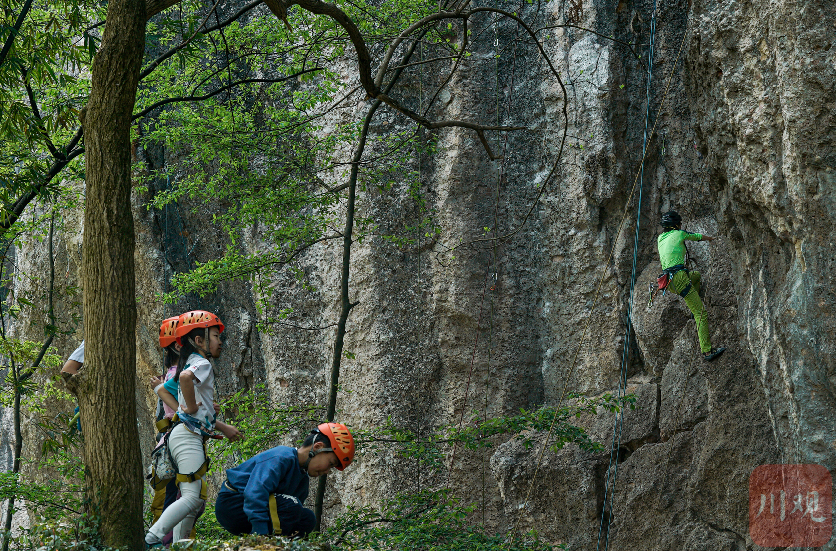 攀岩运动是勇气和信任的训练,同时还能与大自然亲密接触,越来越受到市民喜欢。猴子岩攀岩基地有着垂直30米高度和20多条攀爬线路,是众多攀岩者喜爱的打卡地。在这里,攀岩者有成年人,也有小朋友,都在教练和安全设备的保护下,向着岩壁发起挑战。户外攀岩有一定风险,猴子岩基地是由国家体育总局许可,在教练指导下进行攀岩运动的基地。