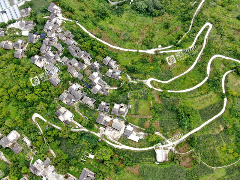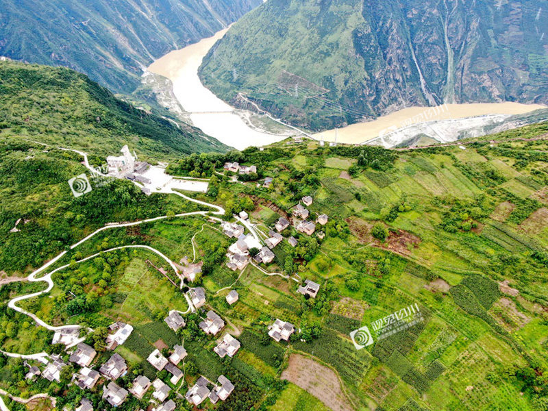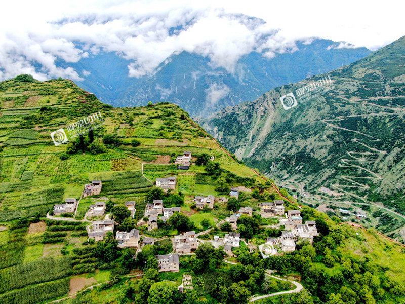 8月15日鸟瞰康定市麦崩乡为舍村。该村共有77户,304人,通过打造乡村特色旅游文化,形成“春赏花、夏纳凉、秋摘果、冬观雪”的民宿旅游观光农业。目前,该村已实现全面脱贫。