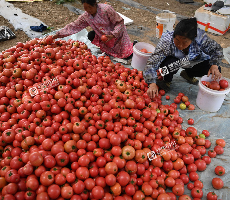 8月15日,康定市麦崩乡为舍村无公害蔬菜大棚里村民正在采收西红柿,并销售到周边城区。