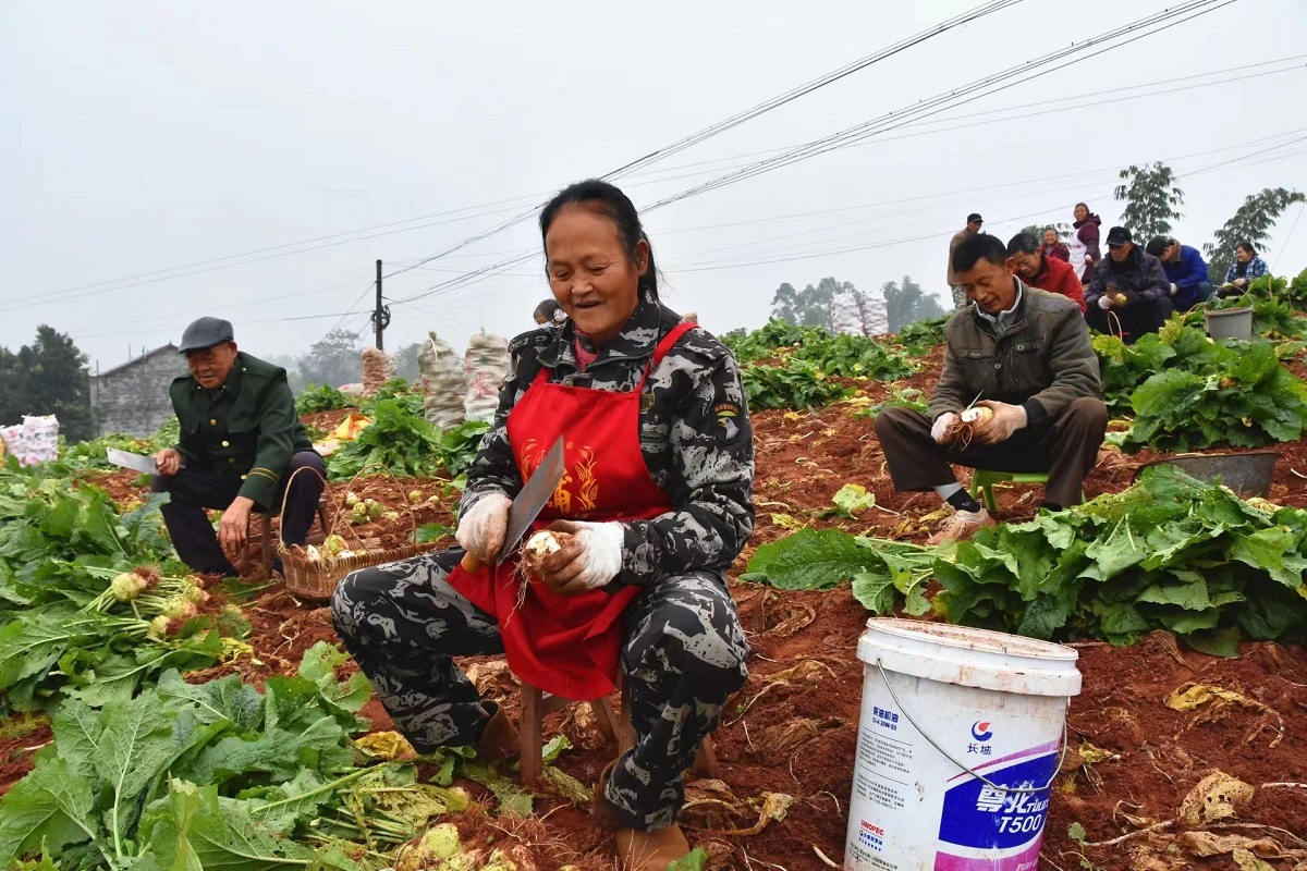 寒冬时节,作为荣县古文镇的特色产业之一的大头菜迎来了收获季。12月12日,在位于该镇柏林坳村的大头菜产业核心示范片区,田间地头随处可见农户采收大头菜的情景。
