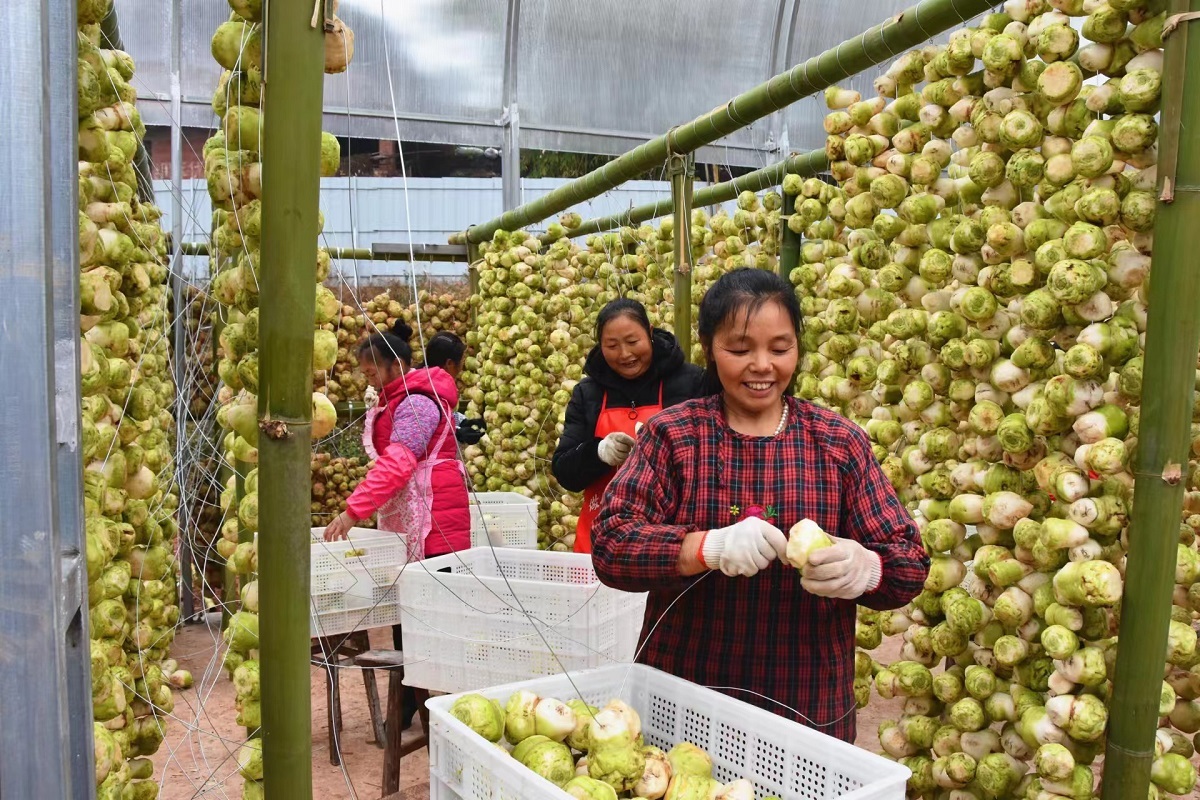 为让大头菜成为带动村民致富奔康的“带头菜”。近年来,古文镇依托柏林坳村丘陵地貌、酸性土壤等自然优势,通过引进大头菜优良品种,完善周边基础设施建设,利用底价包销、订单种植等模式,引导农户发展大头菜种植产业,打造大头菜产业核心示范区。目前,已发展规模化种植6000亩,年产量达1.6万吨。此外,该镇还创新推广“大头菜+南瓜、花生、辣椒”轮作模式,实现一地双收。
