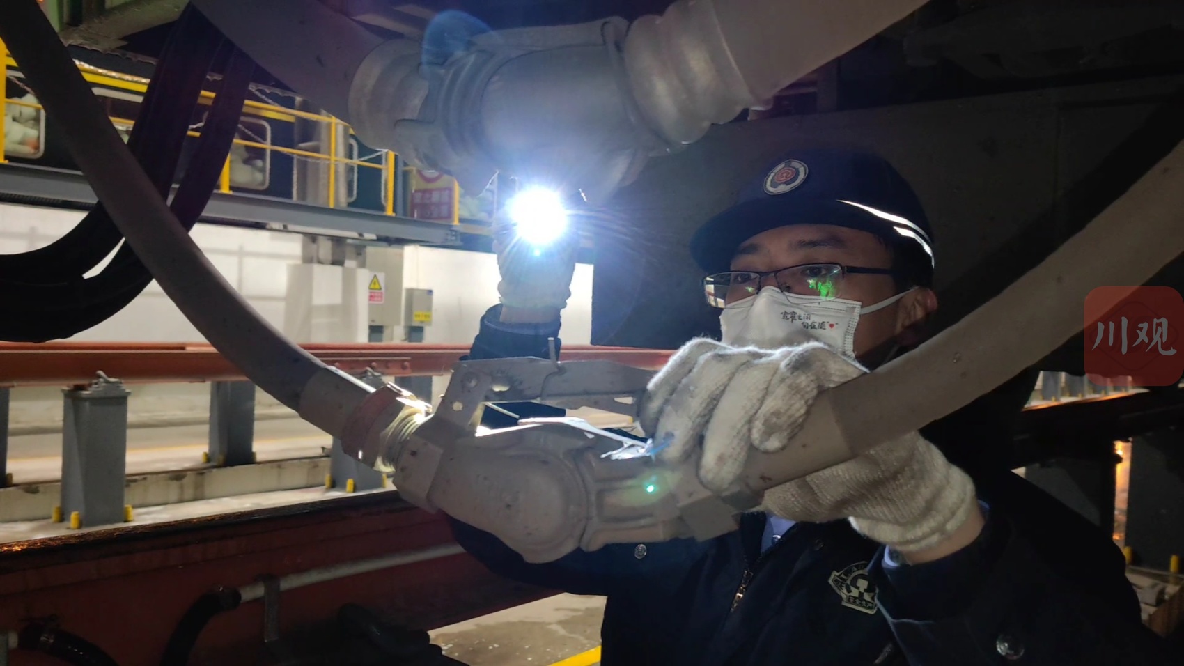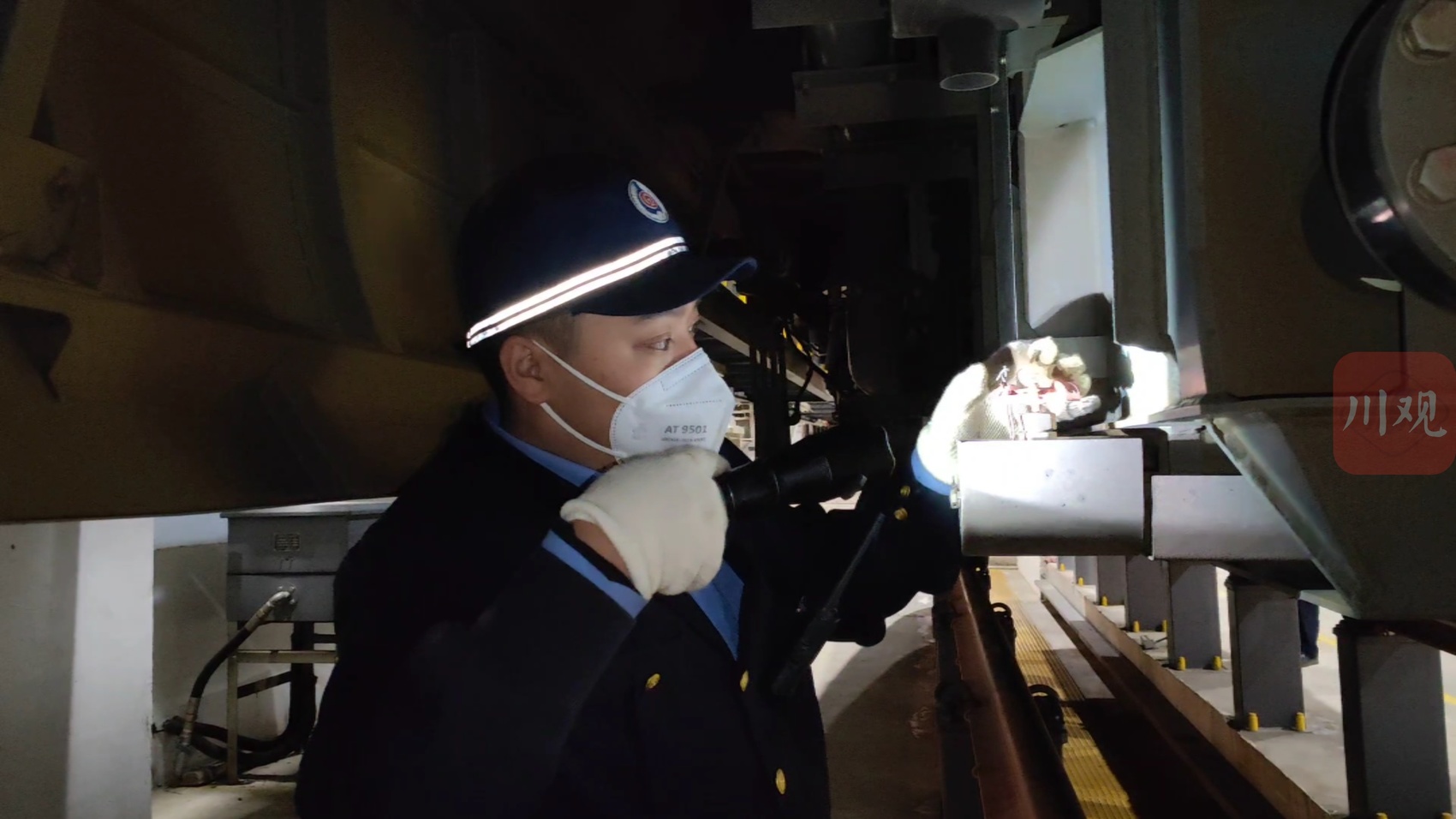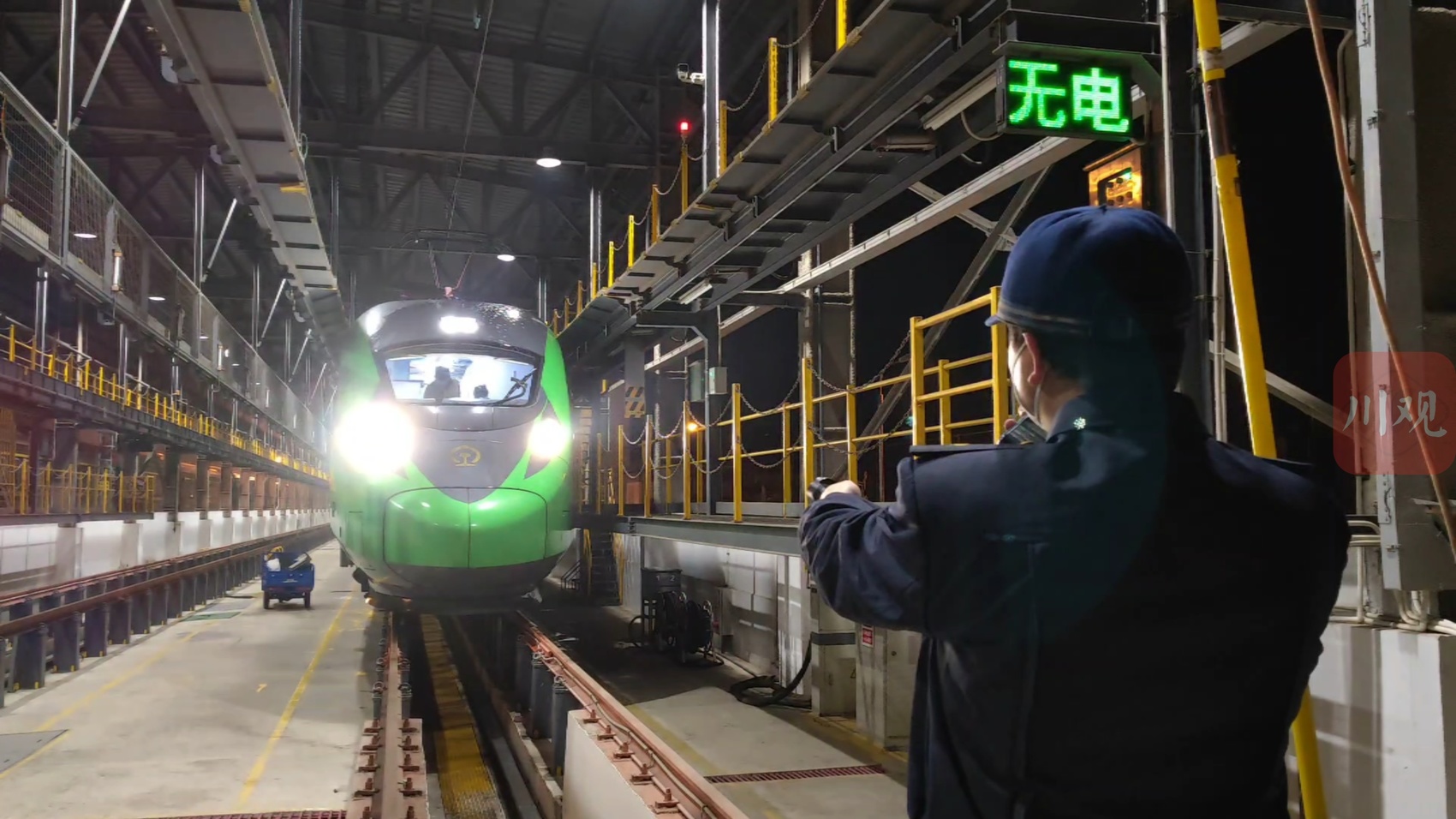 1月21日,除夕夜,攀枝花南客车整备所内灯火通明,机车检修人员手持电筒、工具来回穿梭在检修库内,他们正全面给新成昆铁路上的“绿巨人”——复兴号动车组的车顶、车体两侧、车内等部位覆盖检查、试验和故障处理,确保动车组正点出库运行。