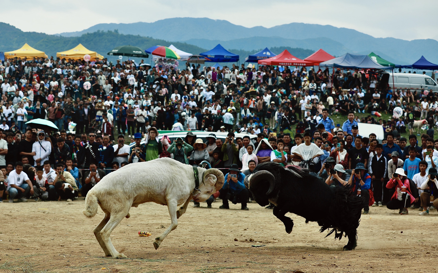 轮到“羊王”上第二轮“战场”了。这只有一百二十多公斤的羊,主人对它寄予极大期望,用红色颜料在它白色的身躯上描出“羊王”二字。“羊王”此刻似乎不情愿上场,8岁的小主人特久日拉和哥哥在后边推,稍长的两位哥哥在前边拉,终于让它进了场。它的对手早已在场中等待,但双方均不愿轻易先出手。最后主人不得不在身后助力推它们一把,让它们迎面而战。“砰”的声音传来,那是羊角碰撞的声音。碰撞、分开、后退、冲刺、迎战……惊心动魄的声音引来观众喝彩连连。