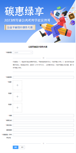 近日,2023年四川省公共机构节能宣传公益平面设计创作大赛正式启动。本次公益平面设计创作大赛由四川省机关事务管理局、四川省教育厅主办,川观新闻承办,将面向全省各级各类学校在校同学征集一批优秀节能环保主题公益平面设计作品(包括主题LOGO设计、海报设计、绘画等多种形式作品)。经过综合评选出优秀作品,最终将由省机关事务管理局、教育厅共同颁发奖状。