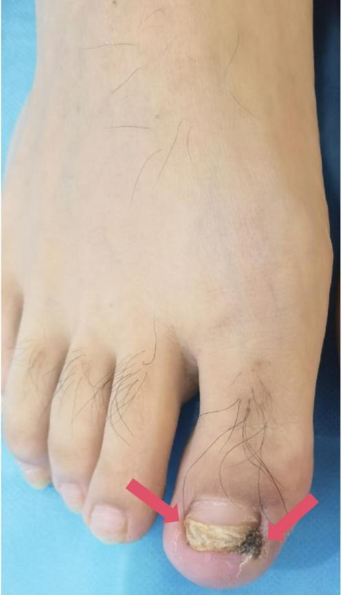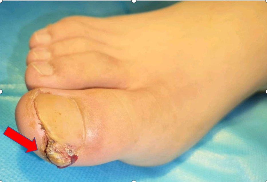 刚刚发生没几天的甲沟炎,一般是急性甲沟炎。原因可能是被人踩了脚趾,或者鞋太紧挤着脚趾,又或者踢到了硬东西等等,脚趾头破了皮,最常出现在脚趾两侧(下图标箭头位置)。