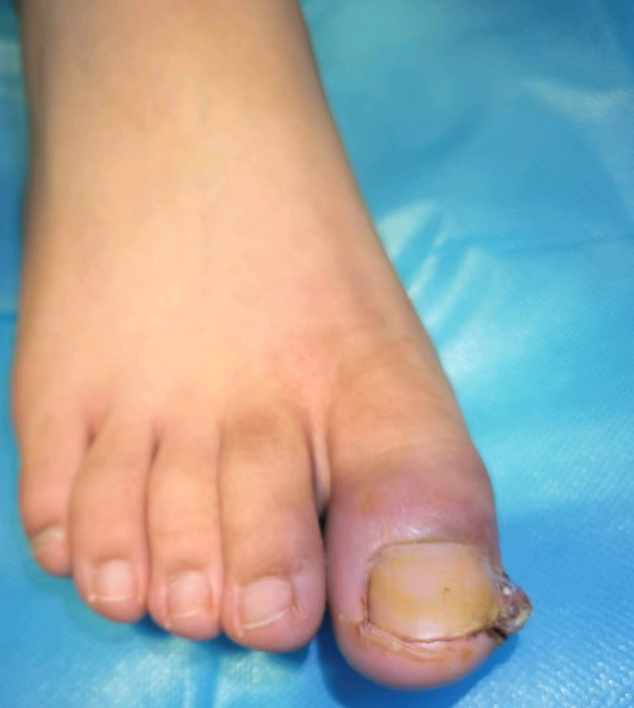 慢性甲沟炎,顾名思义,就是甲沟反反复复发炎,脚趾好不了几天,又肿了。就像下面的脚趾,内侧缘甲沟炎,导致了整个脚趾肿胀。
