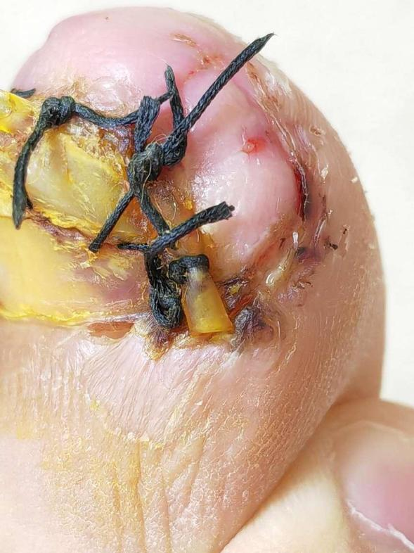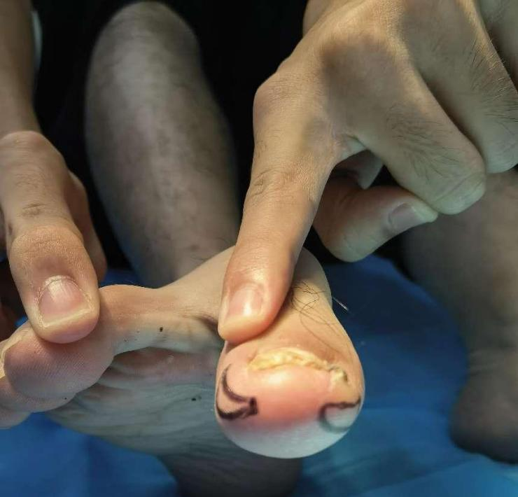 1.甲下置管:简单地说就是给脚趾打个麻药,用一根软管把趾甲和皮肤隔开,不让趾甲切割皮肤,诱导趾甲正常覆盖皮肤。