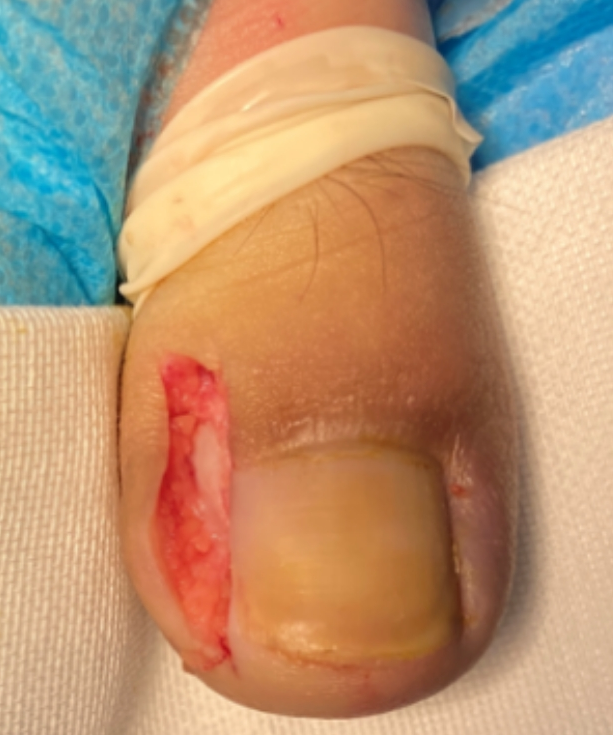 3.部分甲母质切除:甲母质是趾甲的根,把这部分甲母质切除掉,则以后这里就不会长出趾甲。