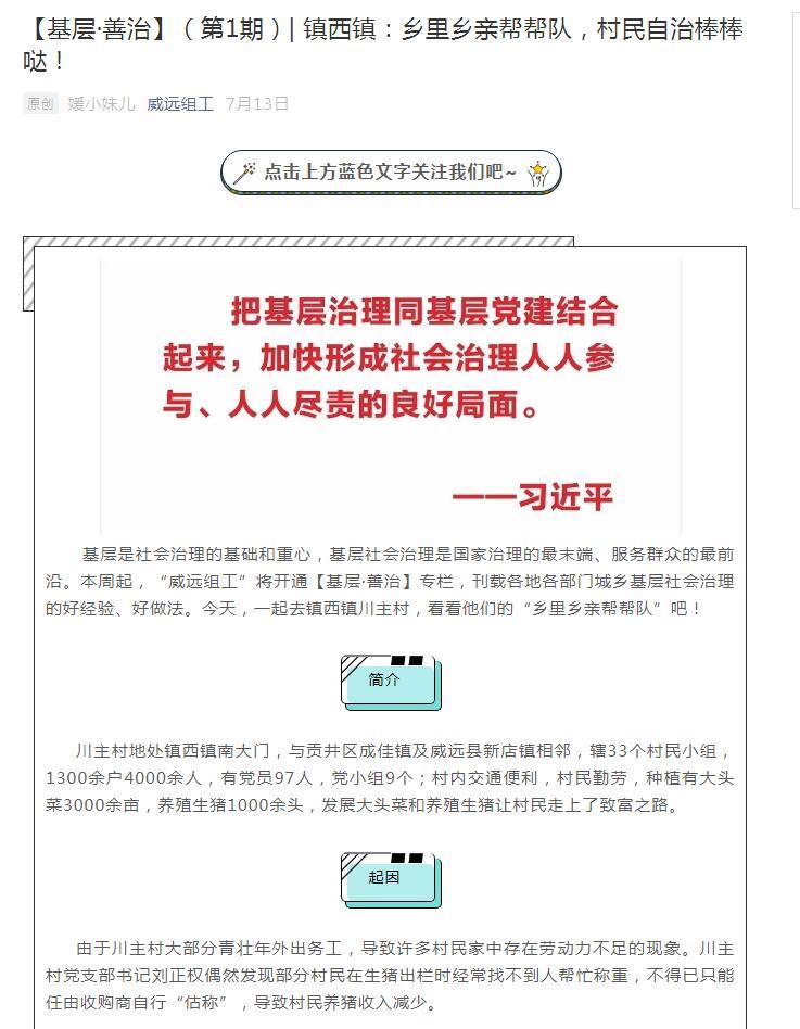 从2020年7月13日起,威远县委组织部在“威远组工”微信公众号推出【基层·善治】专栏,刊载全县各地各部门城乡基层社会治理的好经验、好做法。