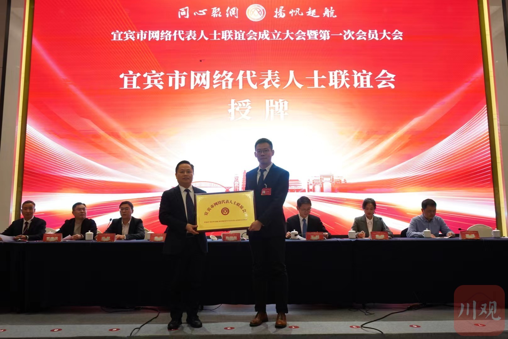 会议通报了宜宾市网联会成立筹备情况、《宜宾市网络代表人士联谊会章程(草案)》起草背景、起草过程等内容,宣读了市网联会第一届当选名单并颁发当选证书。会议选举产生会长1名,副会长10名,执行副会长1名,秘书长1名,监事长1名。