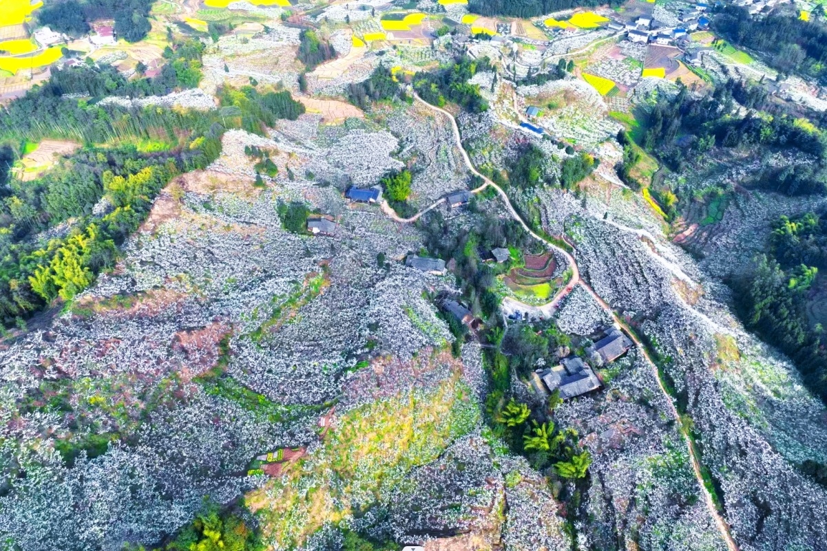航拍洪雅县柳江镇兴胜村千亩李花海 洪雅县融媒体中心供图