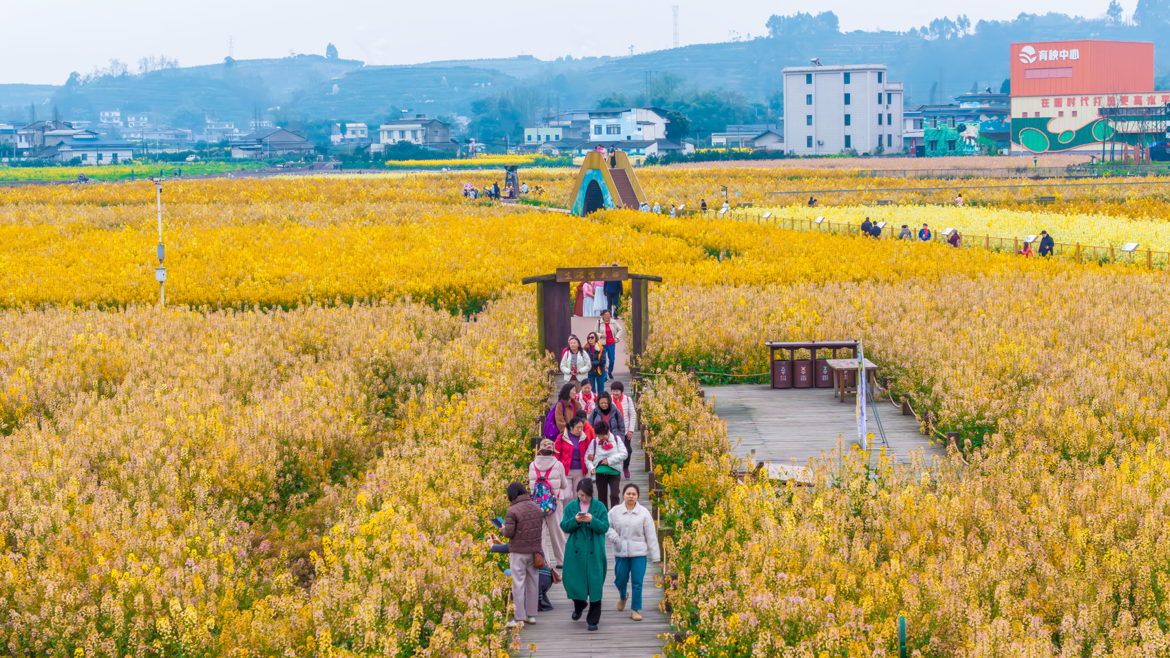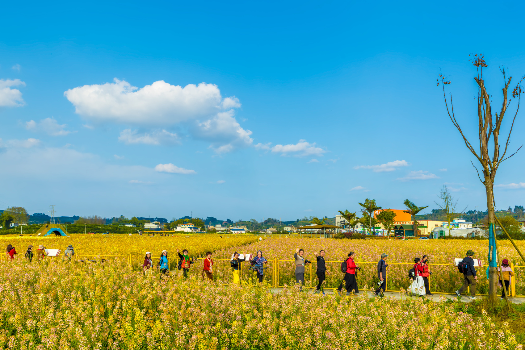 桔香稻田的五彩油菜花田正颠覆春光的传统叙事——淡黄、月白、蜜橙的花色在等高线上交织,宛如瑶池仙子打翻的琉璃盏。当身着五彩的游人穿梭其间,人与自然在此达成奇妙和解,每一道田垄都成了连接童话与现实的彩虹桥。