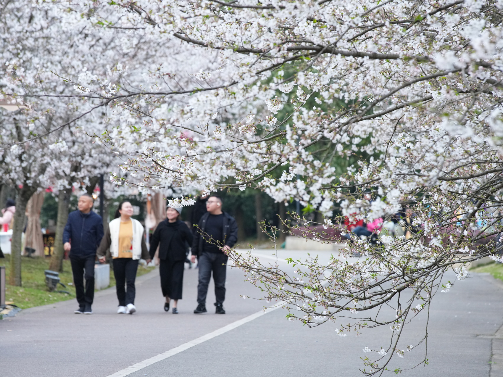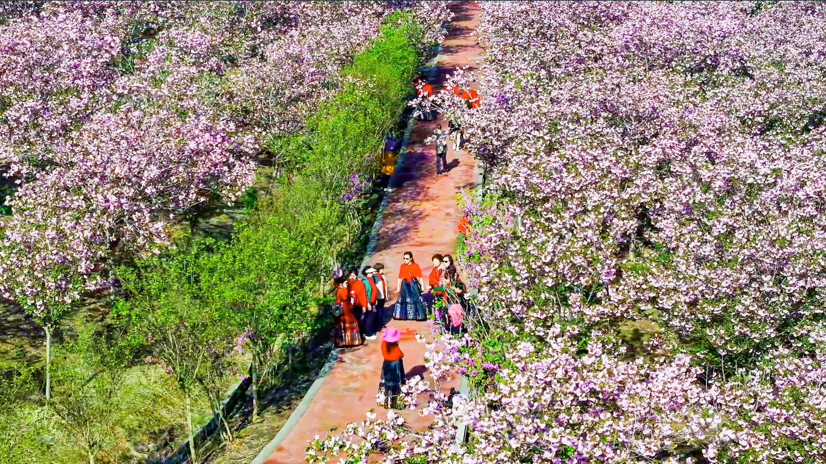 移步文创园,樱云正为现代建筑蒙上古典滤镜。无人机掠过时,可见樱花遍地与游人如织的奇妙叠影,似一幅未干的水墨长卷。飘落露天展馆的瓣雨,恰似拓印而来的立体诗行。