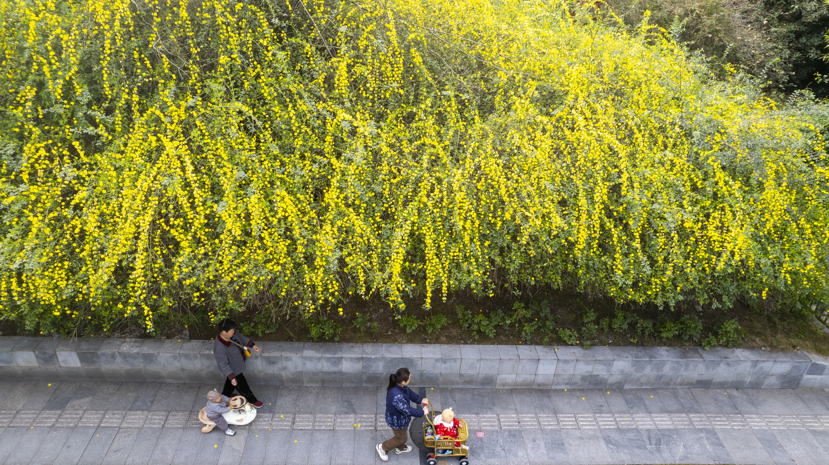 彭溪河与毛河畔的迎春花瀑正以燎原之势蔓延,嫩黄花枝从石缝间倔强垂落,在粼粼波光中织就流动的金色琴弦。晨雾弥漫时,穿行其间的老者与嬉闹的稚童被镀上柔光,恰似《诗经》中“春日载阳,有鸣仓庚”的鲜活注脚。