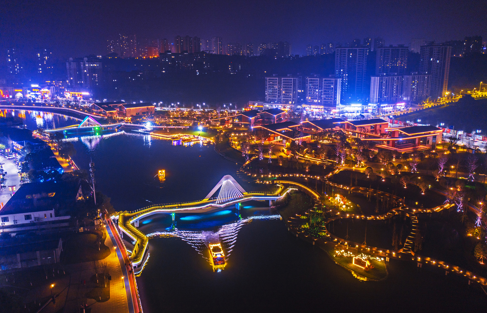 賨城里——夜幕降临,华灯初上,来到賨城里,乘坐游船、画舫在西溪河上缓慢前行,或漫步于两岸,欣赏流光溢彩的夜景,享受惬意的春日夜晚。