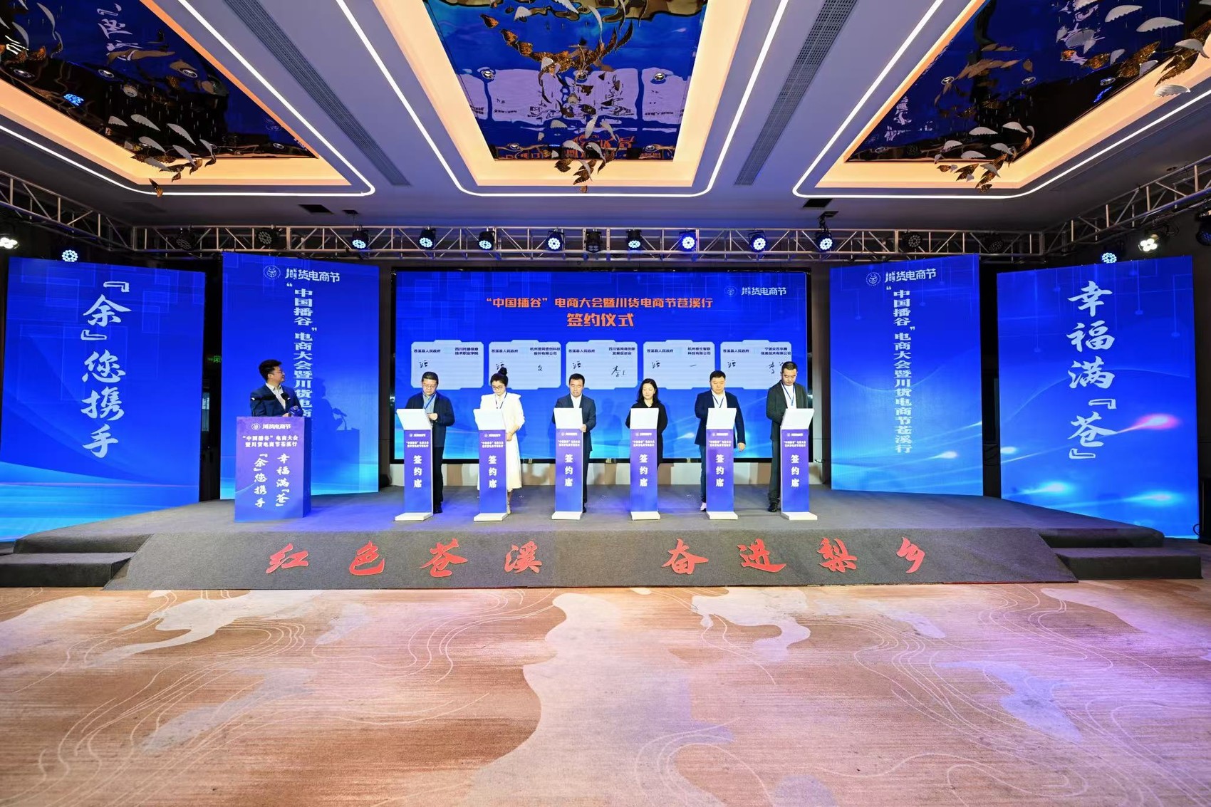 现场,苍溪县人民政府与四川省网商创新发展促进会、四川托普学院、杭州壹网壹创科技股份有限公司、杭州叁生智联科技有限公司、宁波众百华腾信息技术有限公司进行签约,开启合作共赢新篇章。