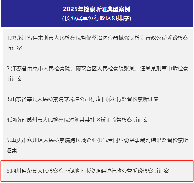近日,最高人民检察院公布2025年检察听证典型案例,荣县人民检察院办理的“督促地下水资源保护行政公益诉讼案”作为全国30件典型案例之一入选。该案通过检察机关在前期走访调查和收集证据基础上,邀请相关领域专家、人大代表等参与公开听证,促推行政机关依法履行职责并建立健全长效机制,推动地下水资源有效保护和行业普遍性问题有效治理。