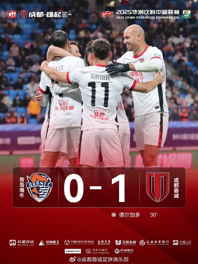 4月12日,2025赛季中国足球超级联赛开始第六轮争夺。客场作战青岛的成都蓉城凭借德尔加多的进球,1比0击败了青岛海牛,用一场胜利庆祝自己进入中超以来的第100场比赛。最近四场比赛保持不败,且取得三连胜的战绩也让成都蓉城攀升到联赛积分榜第二的位置。