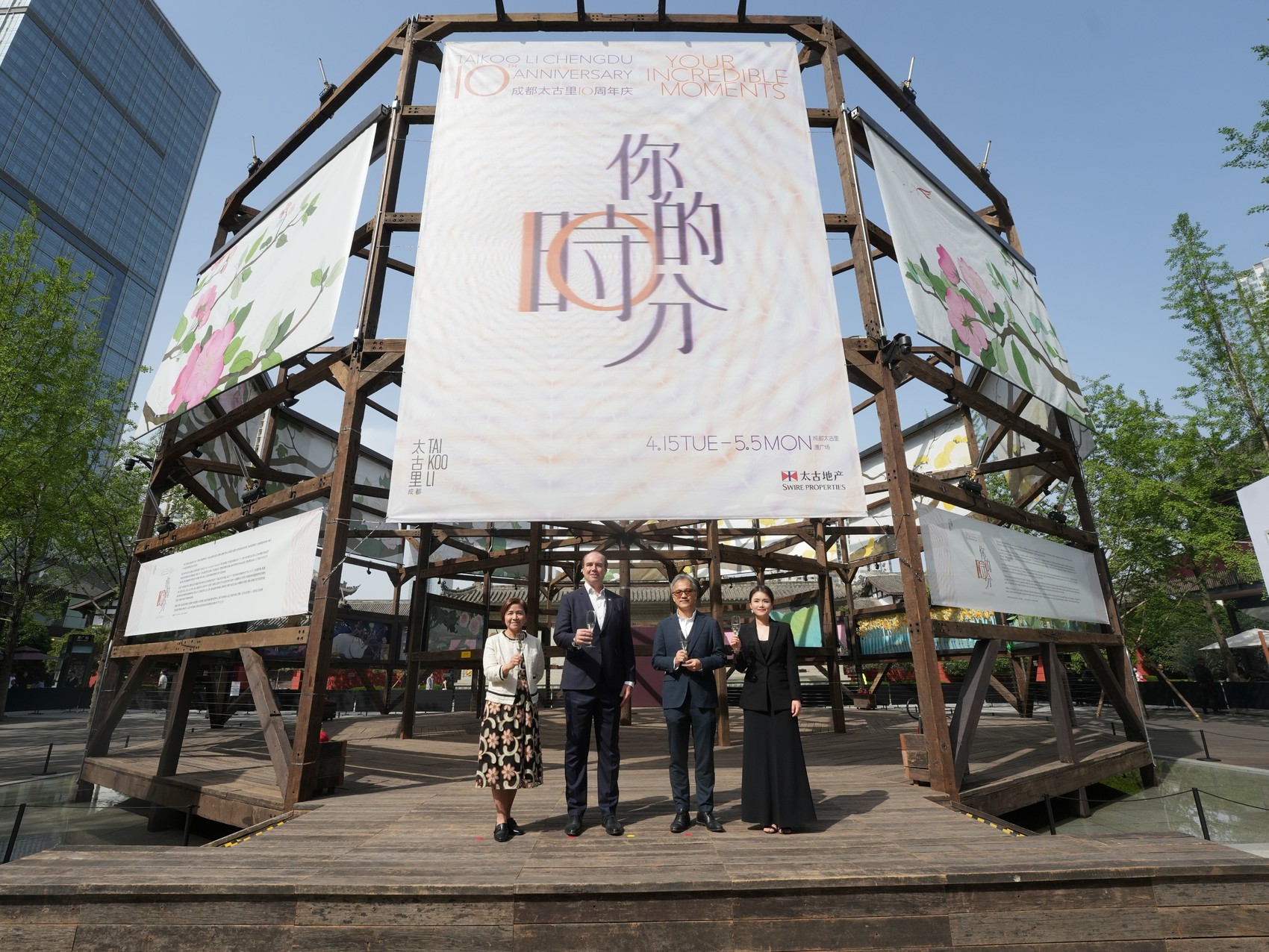 4月15日下午,“你的时分”限时主题展揭幕现场。左起:太古地产财务董事龙雁仪,太古地产行政总裁彭国邦, 太古地产零售业务董事韩置,成都太古里总经理伍玉珊。图据受访者