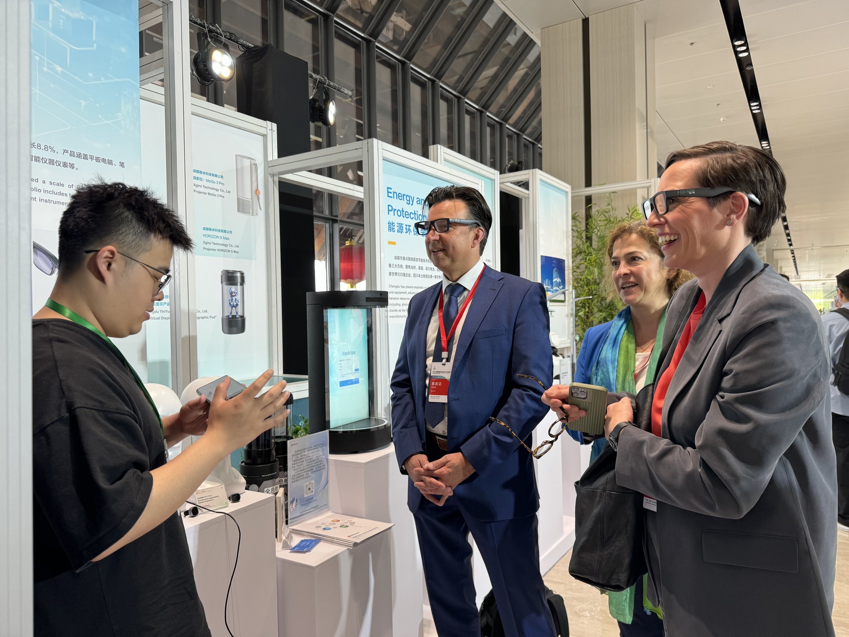 会场外的主题展览上,外宾正在体验同传翻译眼镜。
