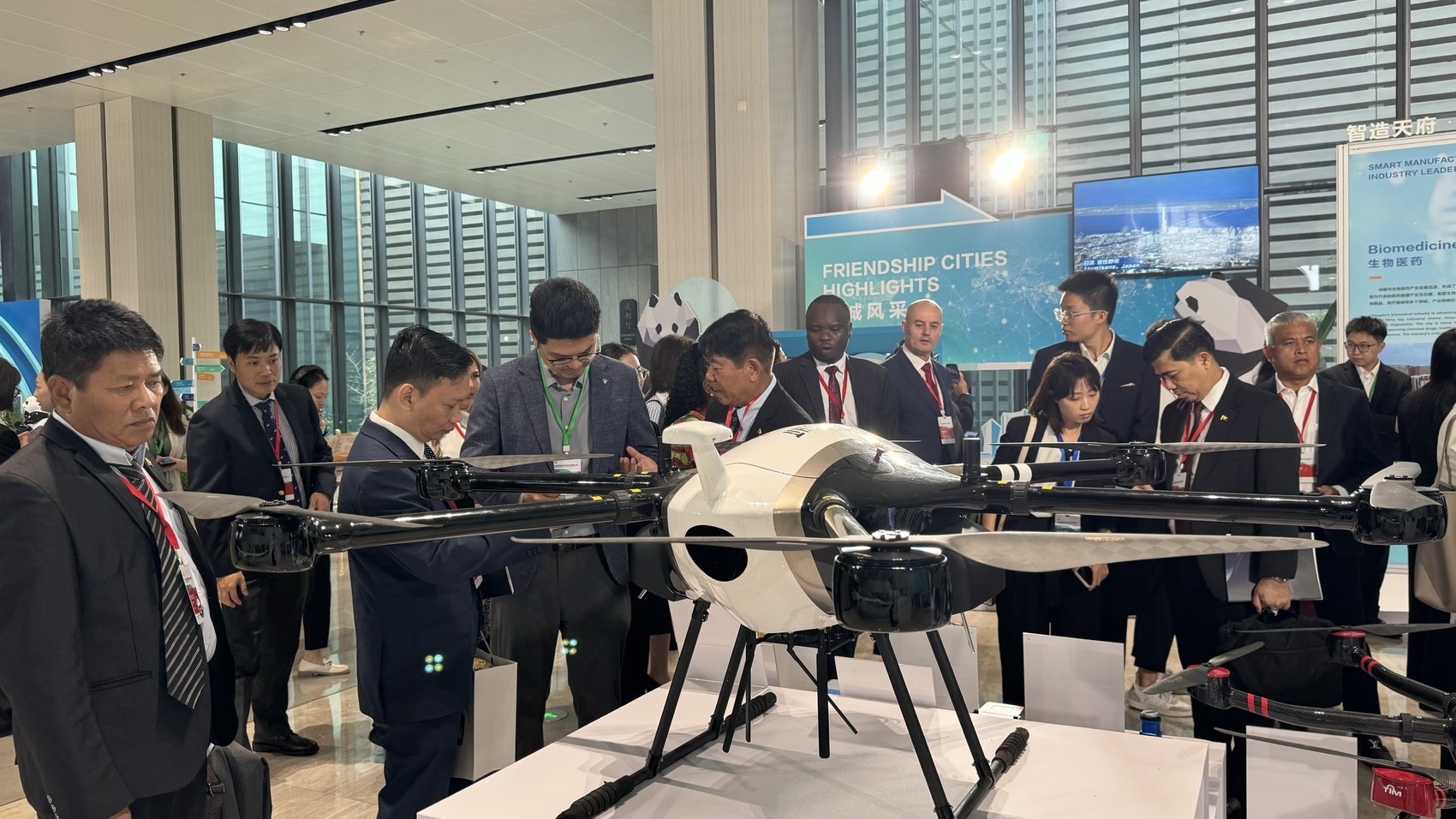 旁边集中展陈的数十架无人机也成为关注焦点,吸引不少嘉宾拍照并咨询。“大多第一句就问是不是‘成都造’,其次对于用来做什么很感兴趣。”成都航维智芯科技有限公司海外负责人黄远奎说,现场集中展示了7家领军企业的产品,比如四川傲势科技有限公司的3.5米×6.9米油电混合无人机,拥有超长飞行时间和卓越的有效挂载能力,适合大规模任务作业,是“蓉品出海”的明星产品。