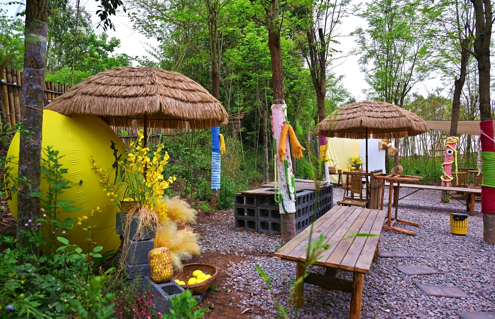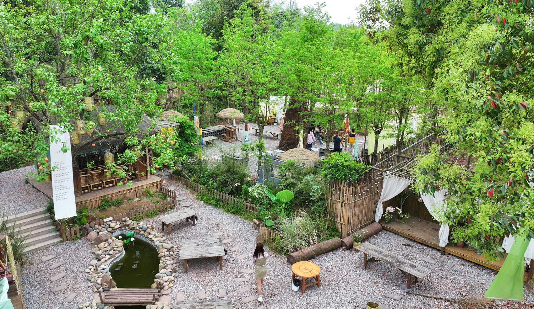 我们沿着彩虹路前行,寻找“项链”上的“珍珠”,一座由闲置农房改造的“归野茶室”尤为引人注目。小院融合了乡村野趣和艺术氛围,许多装饰品都是主人翻新的乡野老物件。茶室还会定期根据节日、气候等更换布置,力求给顾客带来新体验。在这里,游客可以品尝到本地枇杷果酱搭配手工饼干的特色下午茶、手冲咖啡、荷叶茶,原料大多从周边田野就地取材。