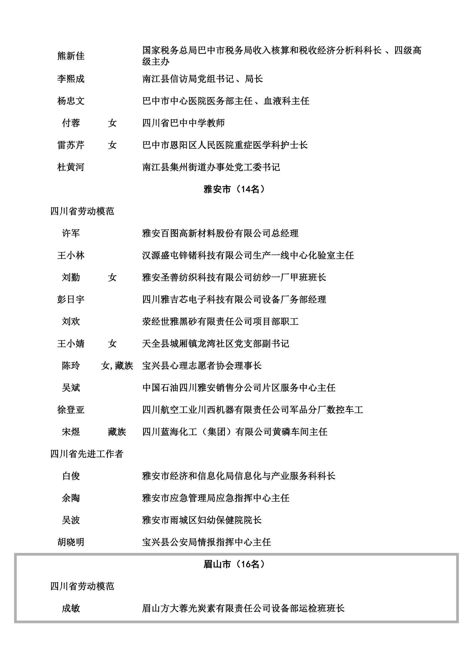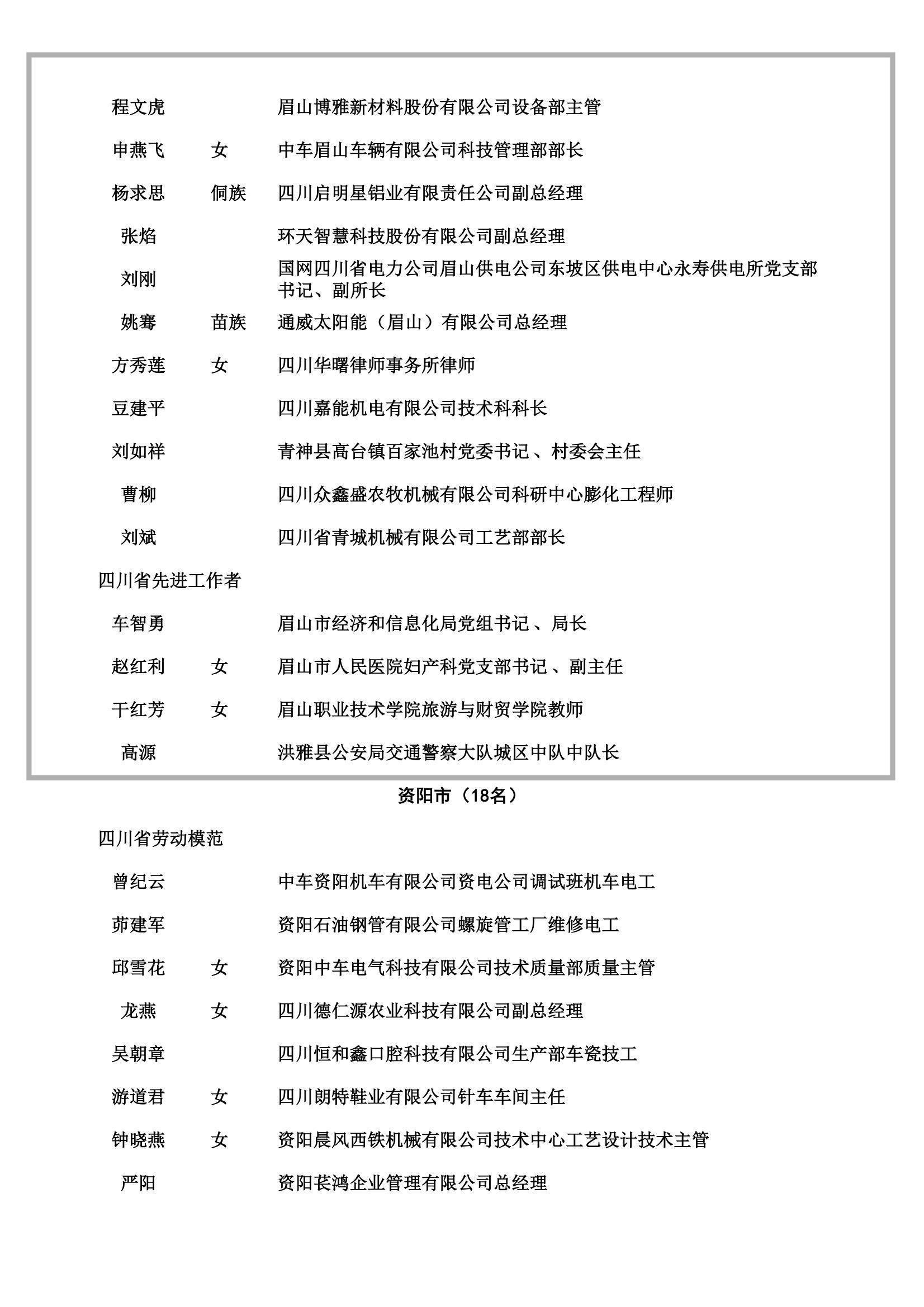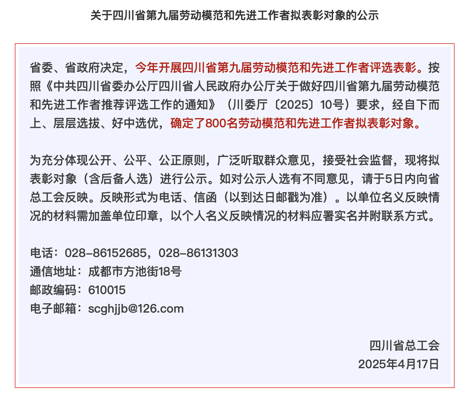 4月17日,四川省总工会发布关于四川省第九届劳动模范和先进工作者拟表彰对象的公示,确定了800名劳动模范和先进工作者拟表彰对象。其中,眉山共有16人上榜,四川省劳动模范12人,四川省先进工作者4人。