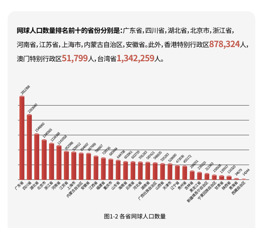 在这份报告中,根据2024年最新调查结果显示,我国网球人口数量25188388人,相比2021年国际网联报告中我国网球人口数量19673497人,增长了5514891人,增长率达28.03%。其中,广东以2812398人排名全国第一,四川以2193660人排名第二。值得一提的是,四川网球人口数量甚至比北京市(排名第四)、上海市(排名第八)两地的网球人口总和还要高。