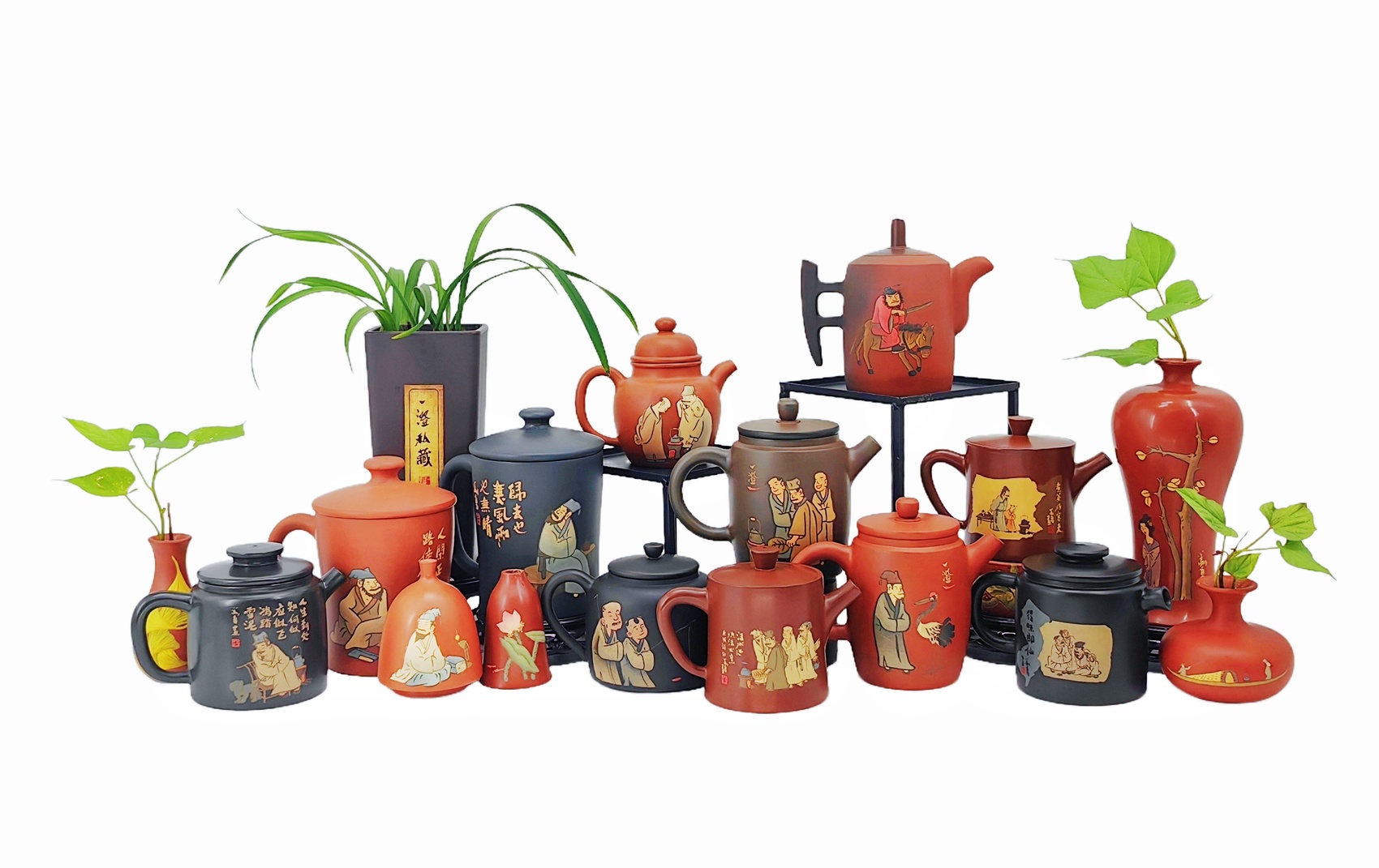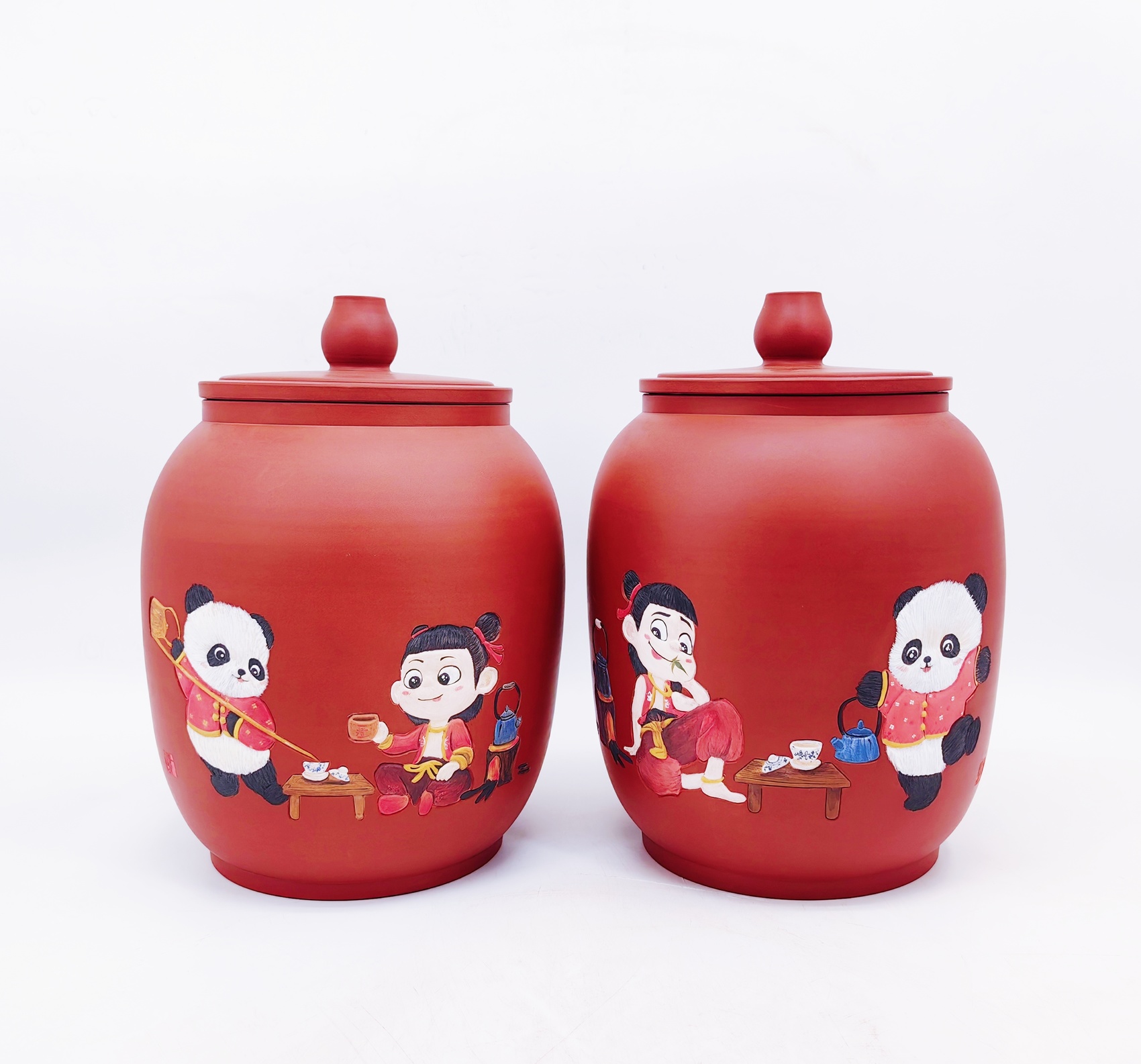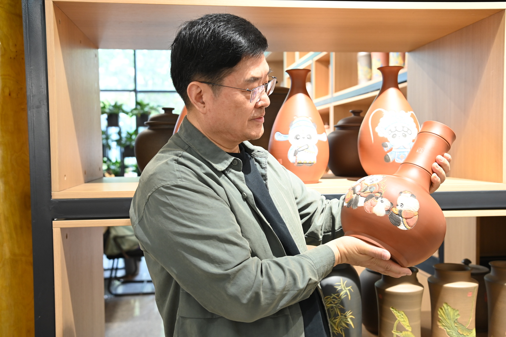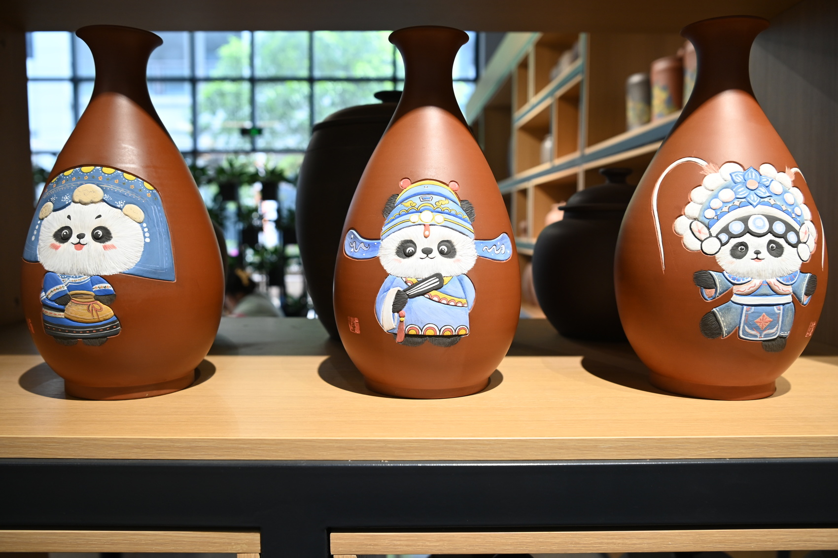 刘勇介绍,近四年时间里,围绕文化赋能荣县陶这个“根”,下足功夫搞设计、融入巴蜀文化抓创作、结合荣县陶泥特点做特色,设计研发了涉及茶具、酒器、陈设摆件三个大类系列文创陶产品,带领近40人的团队烧制出栩栩如生、文化底蕴深厚、具有代表性的近3万件规格各异的产品,其中包括千里江山系列、五牛图系列、大熊猫系列、苏东坡系列、陆游系列、四川地域文化系列、川剧变脸系列、哪吒系列等等。