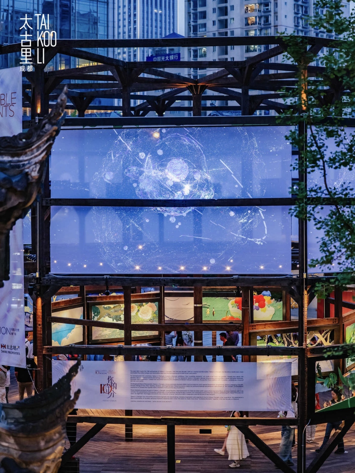 照壁向外一面,苏东坡题词的“精妙冠世”留存至今。十边形概念空间,将十幅立体艺术插画融入其中,描绘成都太古里十年来与城市及公众之间的十个高光“时(10)分”,启发公众在此探索属于自己的高光“时分”。