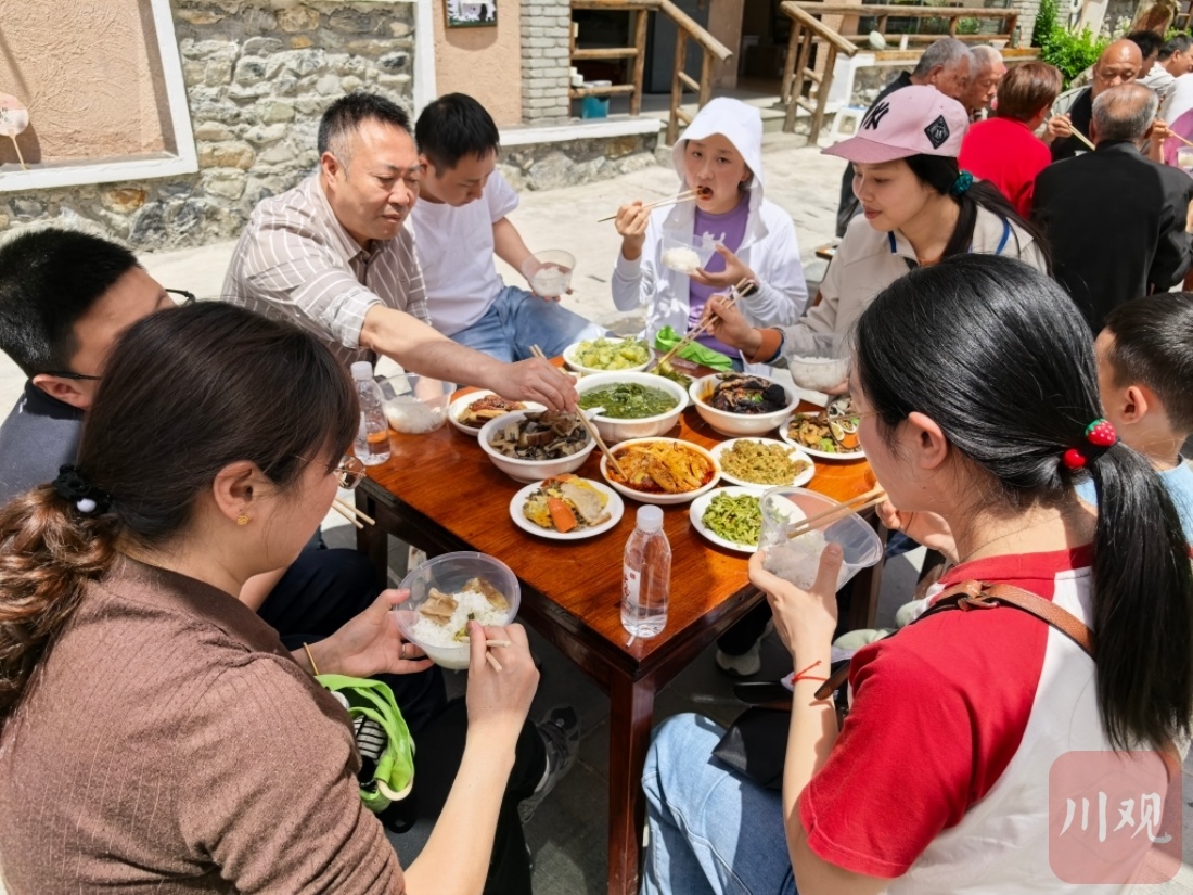 正午时分,一场规模盛大的土菜宴在村中心广场开席。400余名游客围坐一堂,品尝以宝兴腊肉、跑山鸡、鲜竹笋等本地食材烹制的特色菜肴。“这是刺龙苞,生长在海拔1200米以上的珍稀野菜。”当地村民杨维霞热情地向游客介绍每道菜品的来历,让这场坝坝宴不仅满足了味蕾,更让游客们体验到宝兴的当地民俗。