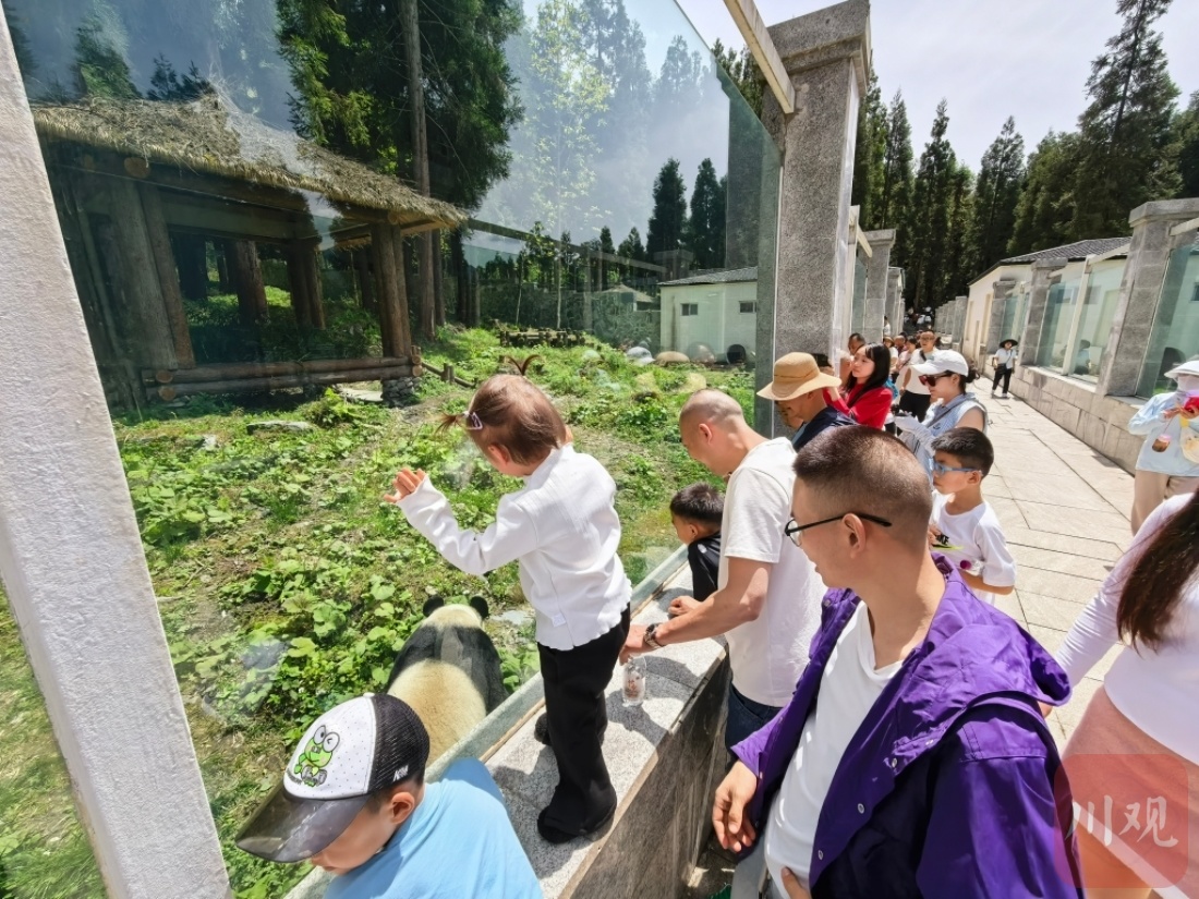 在熊猫园,6只憨态可掬的大熊猫成为最受欢迎的“明星”。圆滚滚的萌宝们或悠闲啃竹,或嬉戏打闹,引得游客们纷纷驻足拍照,现场欢笑声不断。在室外活动区,熊猫“星睿”正抱着新鲜的竹笋大快朵颐,时不时还抬头看看围观的人群,呆萌的表情惹得游客们直呼“太治愈了”。