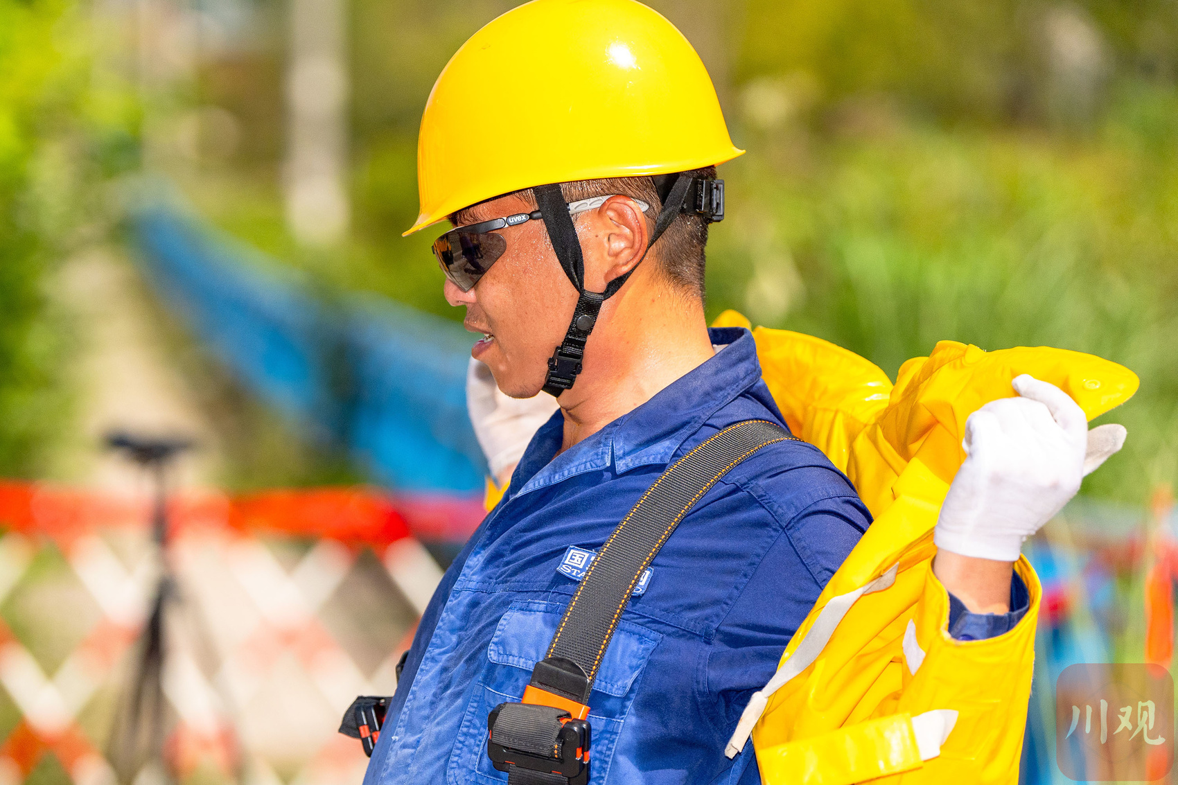 2025年6月10日,绵阳市游仙区电力作业检修现场,带电作业人员在穿戴绝缘屏蔽装备的过程中就已经满头大汗。