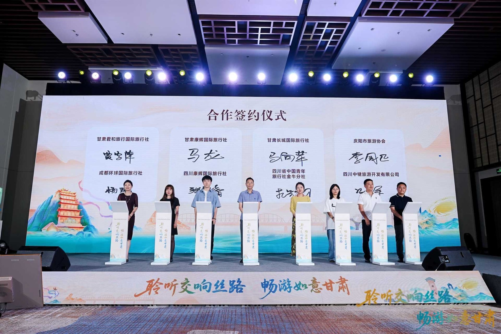 文旅合作,企业先行。活动现场,来自四川和甘肃的16家文旅企业现场签约,达成共识、加强沟通,推动线路共享、客源互送,携手开创两地互利共赢发展的新篇章。主办方表示,“希望以本次推介会为契机,双方紧密携手,抢抓机遇,充分发挥资源禀赋互补优势,持续深化人文交流和旅游协作,让巴蜀韵味与陇原风情在更广阔的舞台上交相辉映,推动“交响丝路·如意甘肃”与“天府三九大·安逸走四川”两大品牌相得益彰、美美与共。