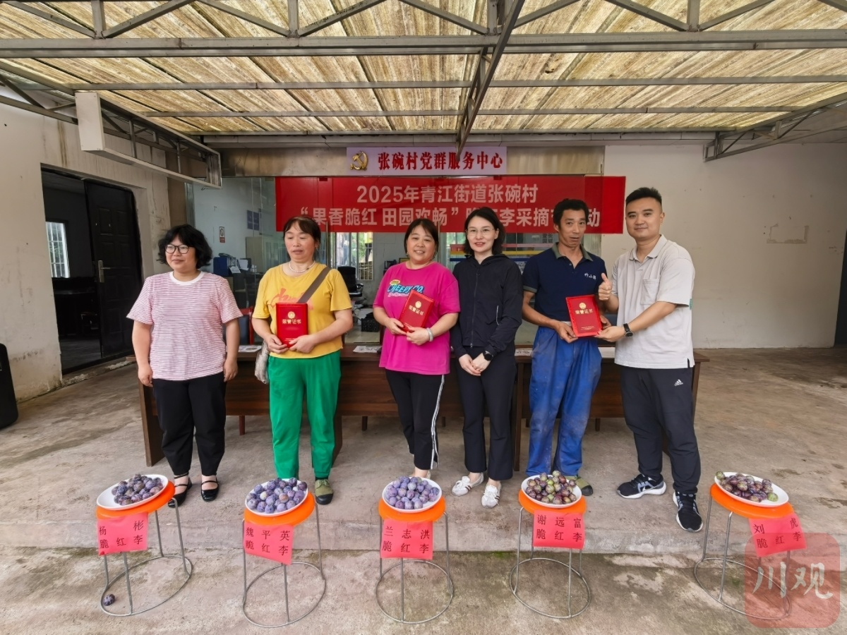 据了解,张碗村脆红李产业已形成“线上直播引流+市场渠道拓展+田园采摘体验”的立体销售网络。采摘节精心设计互动环节——游客现场品鉴投票选出“种植能手”,优胜者喜获化肥奖励,种植户们登台分享宝贵管护经验,带动更多村民科学种植、提升品质。