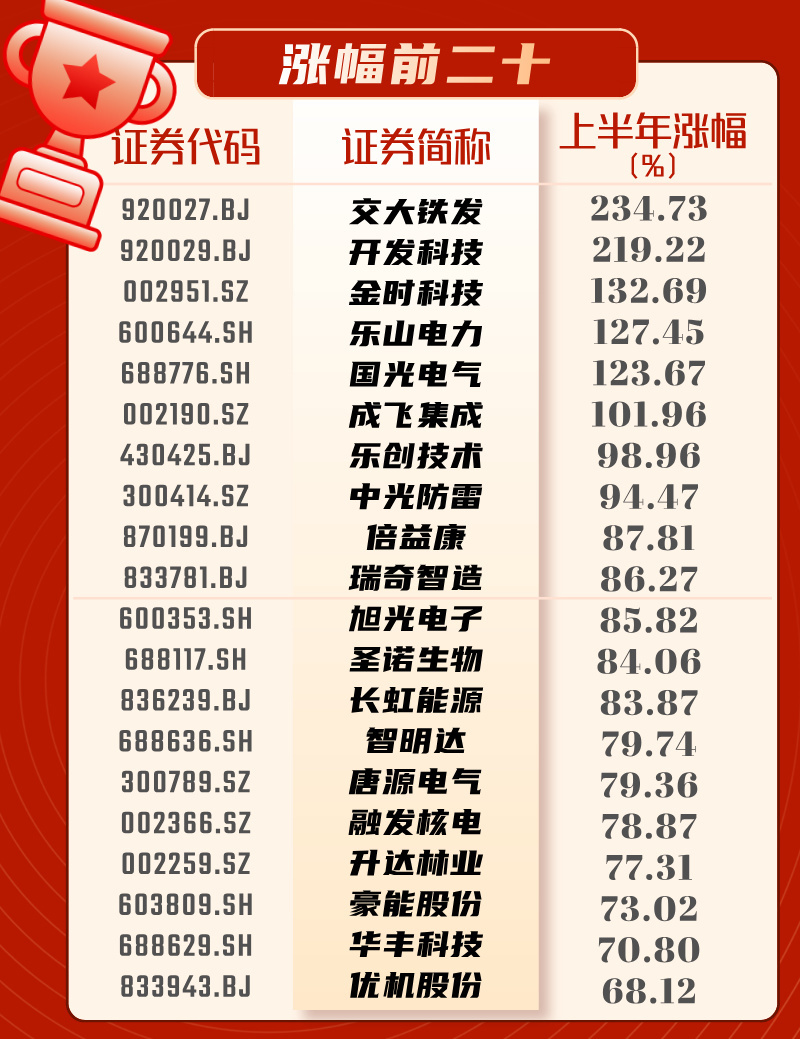 今年上半年,川股中涨幅最大的两只个股均属于次新股。其中在6月10日上市的交大特发涨幅最大。交大铁发发行价格为8.81元,上市首日股价最高摸至34.88元,涨幅达295.91%。不过,交大铁发并未能保持强势,股价在随后的交易日中连续回落,截至6月30日收盘,交大铁发报29.49元,累计涨幅达234.73%。
