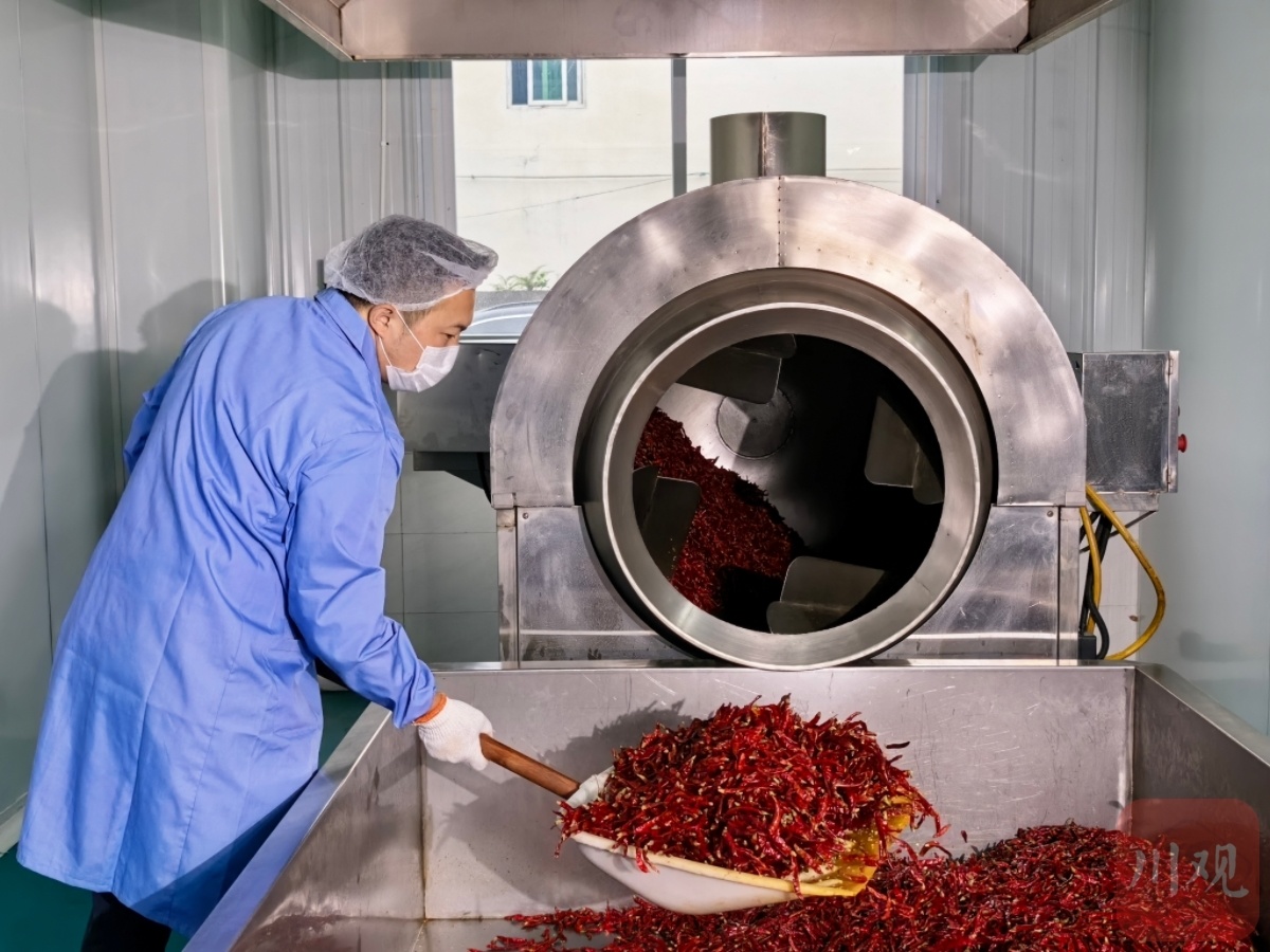7月8日,在雅安市雨城区上里镇雅安川椒雅味食品有限公司厂房里,巨大的炒锅隆隆作响。工人们将鲜红的辣椒倒入锅中翻炒,水分渐渐蒸发,浓郁的椒香随之升腾。待辣椒炒干,再淋入金黄的菜籽油复炒,香气瞬间弥漫整个车间。这口一次可炒制百斤辣椒的大锅,日复一日地产出着优质干辣椒,成为村民致富的“金钥匙”。
