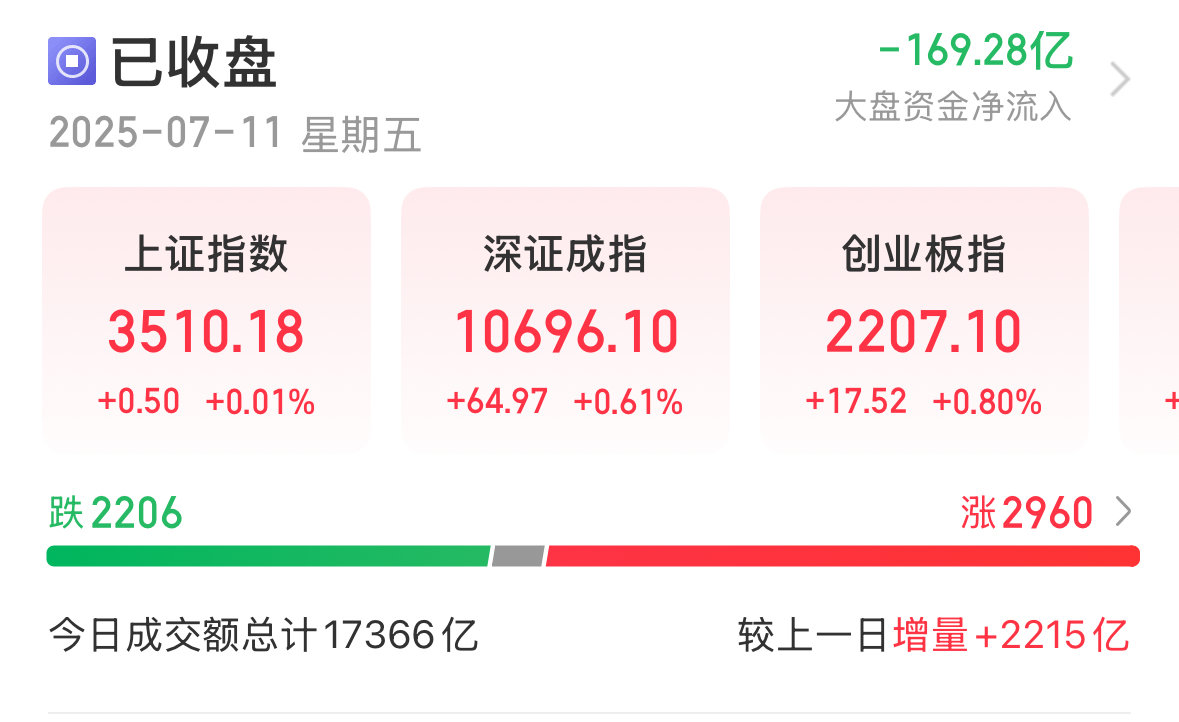 7月11日,A股市场热度不减,继续奏响上涨进行曲。沪指冲高回落,盘中涨幅一度达到1.3%,报3555.22点。截至收盘,沪指微涨0.01%,收报3510.18点;深证成指涨0.61%,收报10696.10点;创业板指涨0.80%,收报2207.10点。全市场成交额17366亿元,较上日放量2215亿元。全市场超2900只个股上涨。