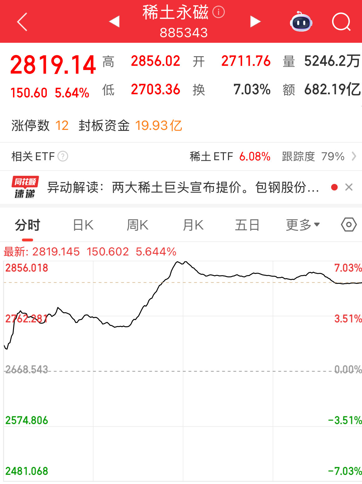概念板块方面,稀土永磁概念再度大涨。奔朗新材股价涨幅达29.95%,以18.92元每股的价格,站上有史以来最高位。北方稀土已连续两日强势涨停。中科磁业、五矿发展等股票也在盘中强劲上涨。