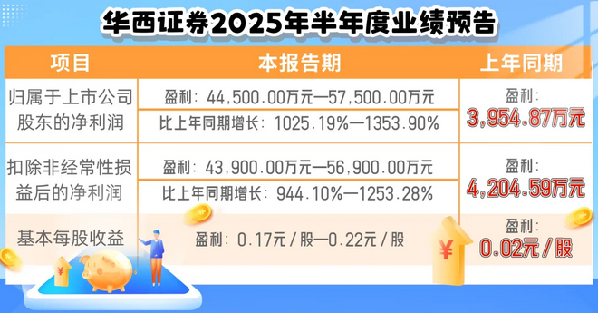 从华西证券披露的2025年半年度业绩预告来看,公司预计,2025年1月至6月,归属于上市公司股东的净利润为44500万元至57500万元,同比增长1025.19%至1353.90%。